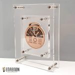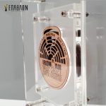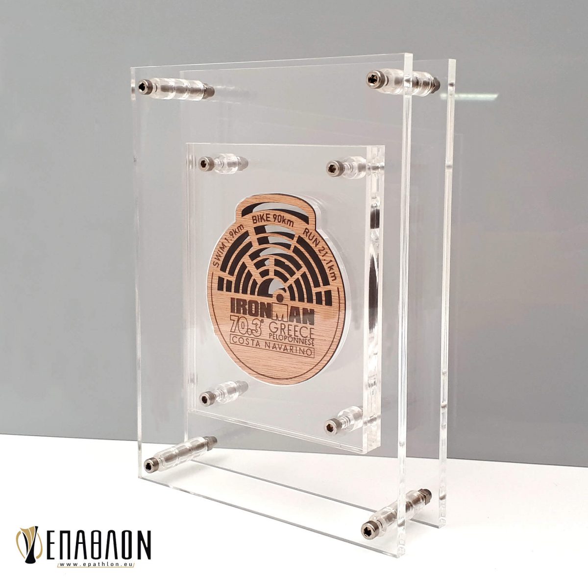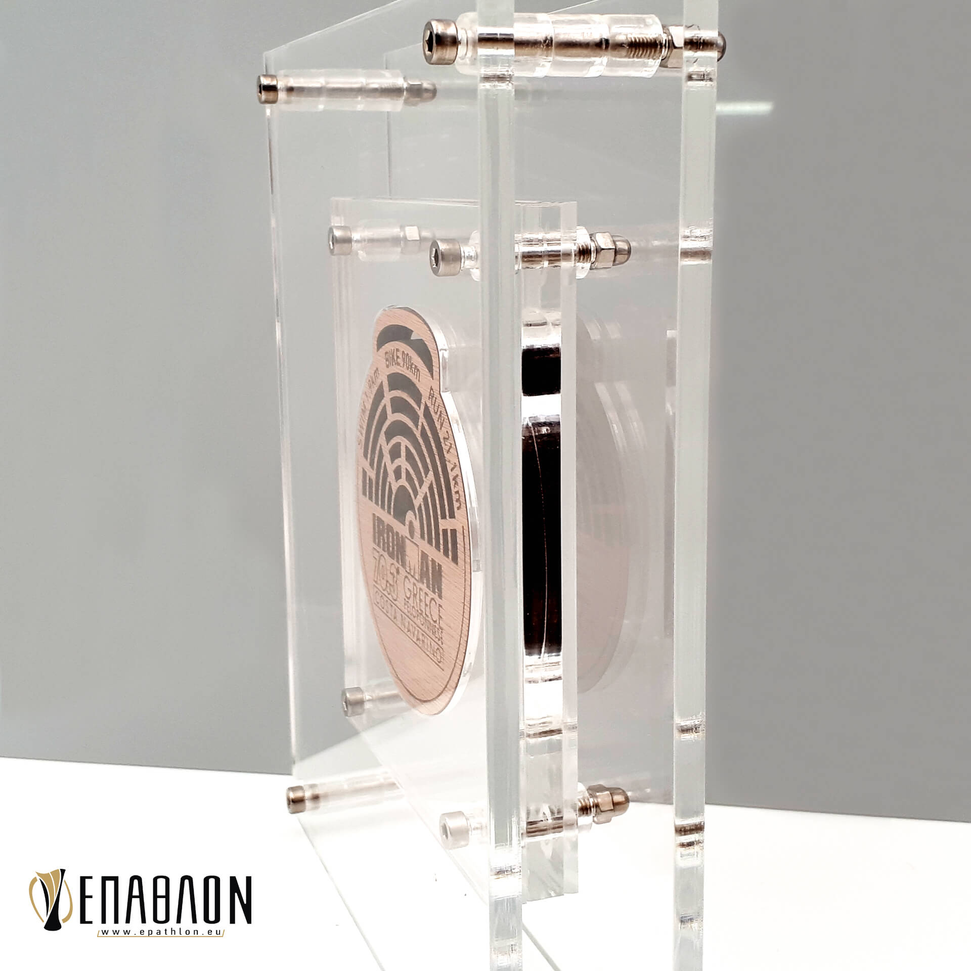 Custom διακοσμητική πλακέτα από ακρυλικό για την τοποθέτηση μεταλλίου Διάσταση 20x15cm • Υλικά: Διάφανο ακρυλικό πάχους 8mm, 6mm και 3mm, ξύλο κόντρα πλακέ οκουμέ πάχους 4mm με χάραξη