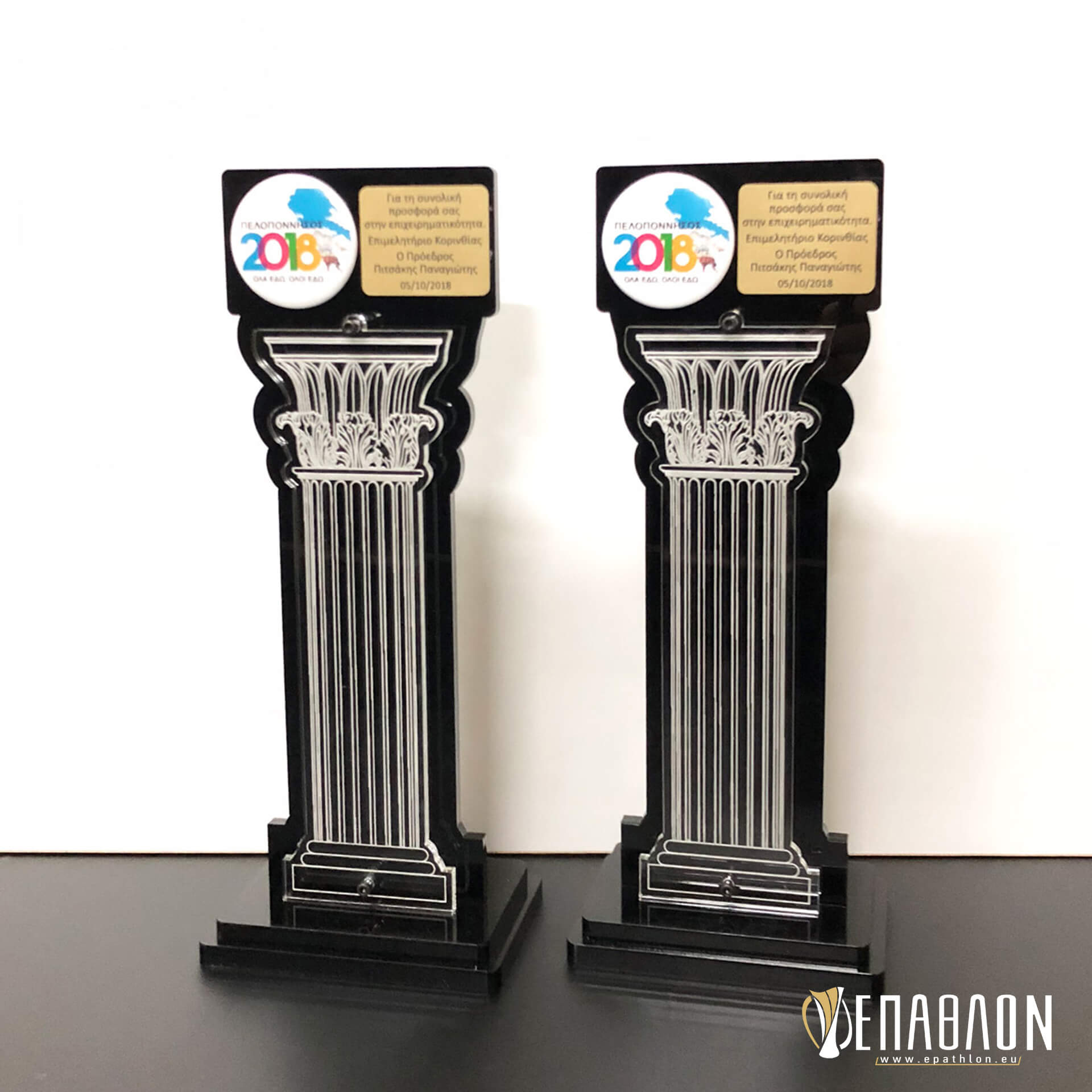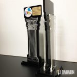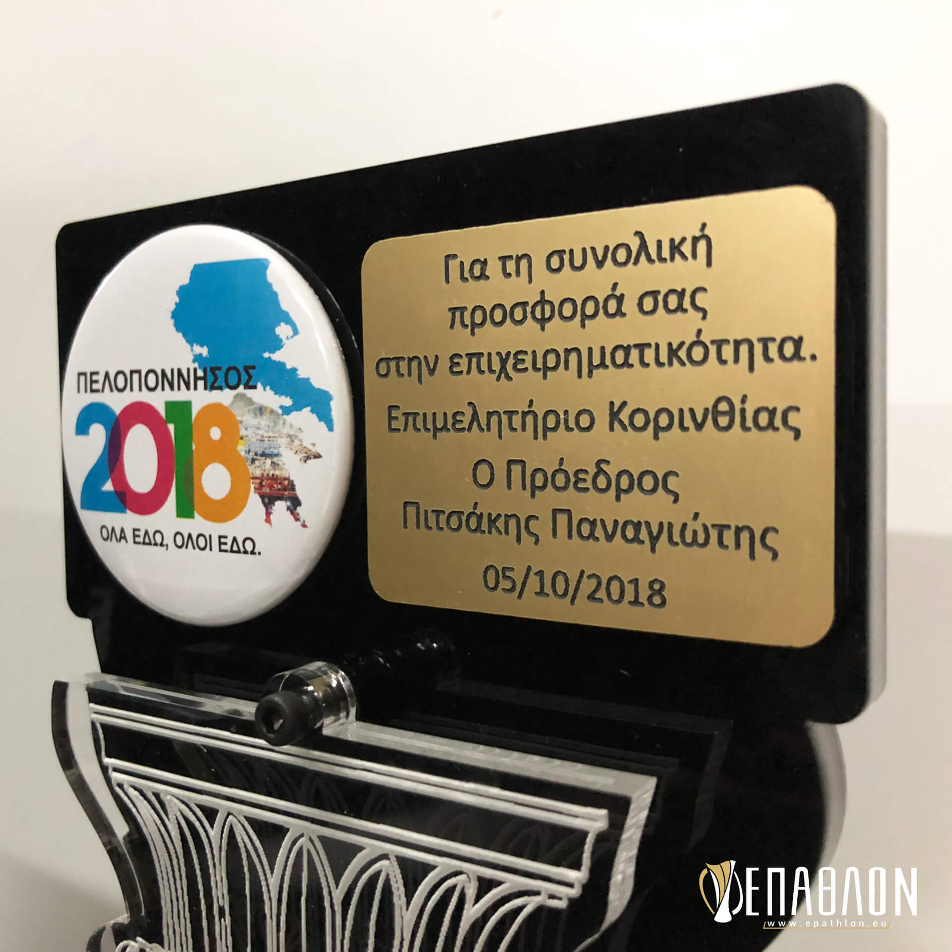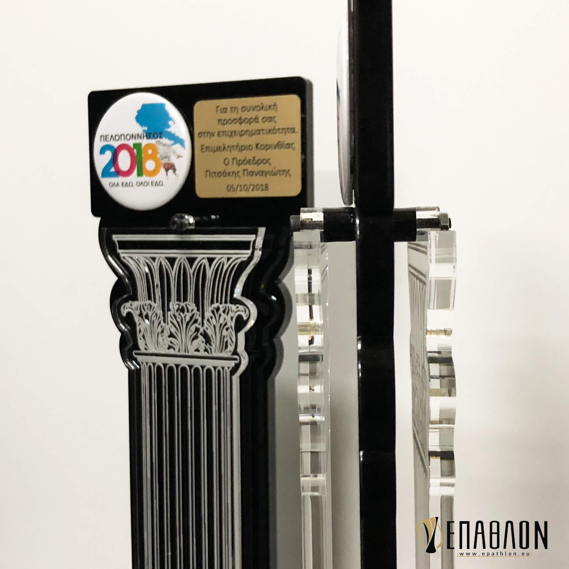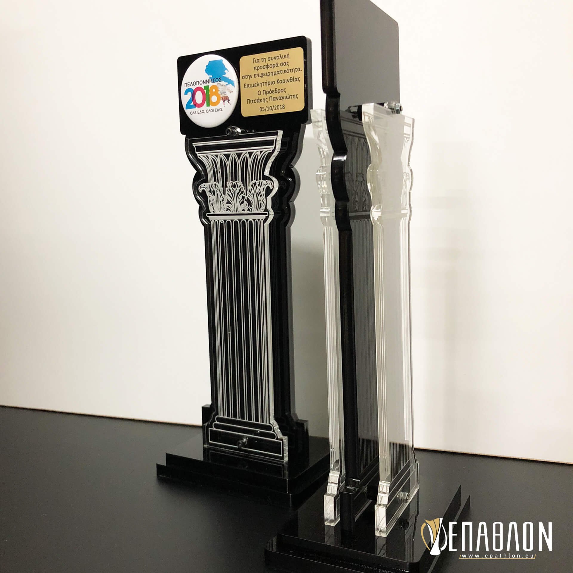 Custom αναμνηστική πλακέτα από το συνδυασμό ακρυλικών • Υλικά: Μαύρο ακρυλικό πάχους 8mm, διάφανο ακρυλικό πάχους 6mm με χάραξη σε μπροστά και πίσω όψη, ταμπελάκι από χρυσό darwin με χάραξη και το λογότυπο σε κονκάρδα, βάσεις από μαύρο ακρυλικό
