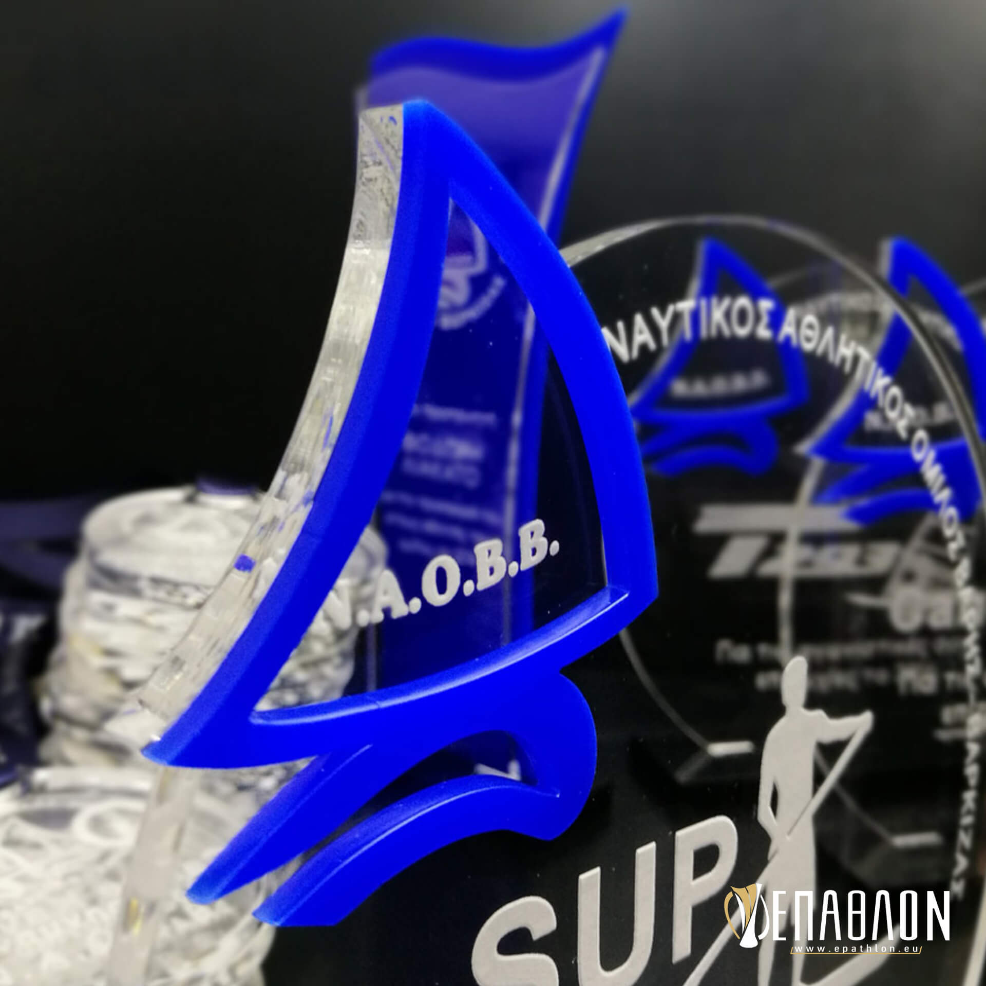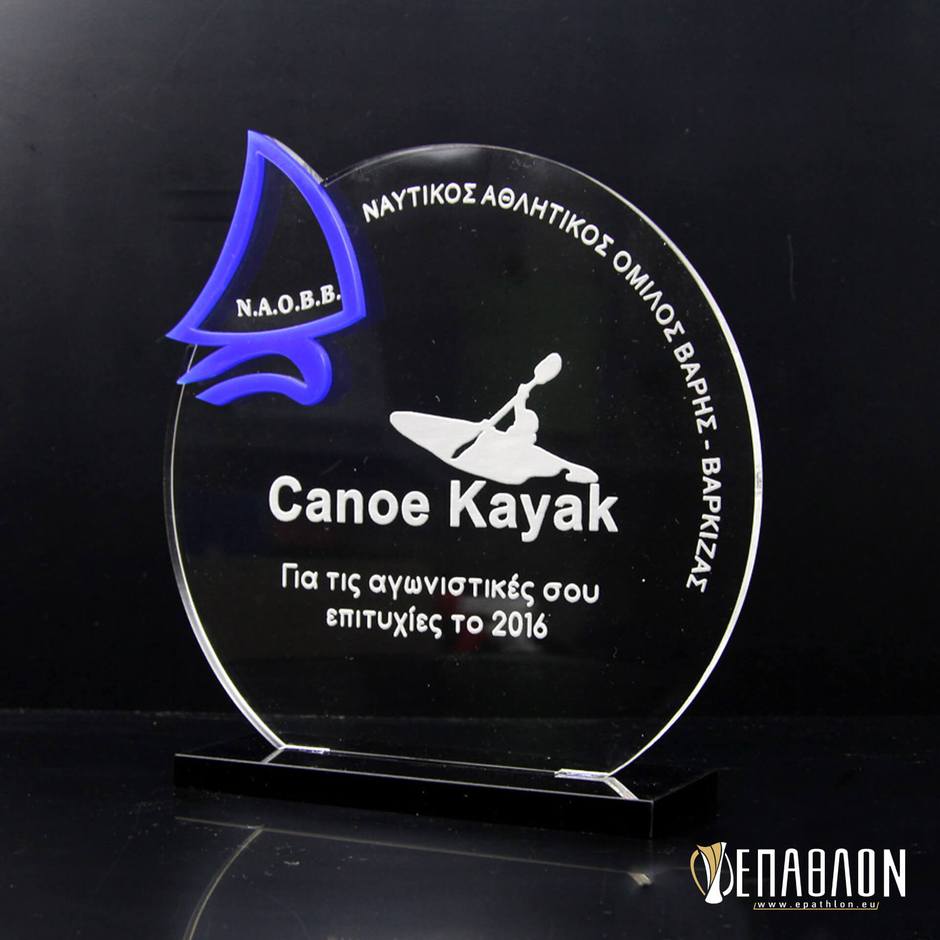 Custom αναμνηστική πλακέτα από ακρυλικό με θέμα Canoe Kayak • Υλικά: Ακρυλικό διάφανο πάχους 6mm με χάραξη, μπλε ακρυλικό πάχους 3mm, βάση από μαύρο ακρυλικό