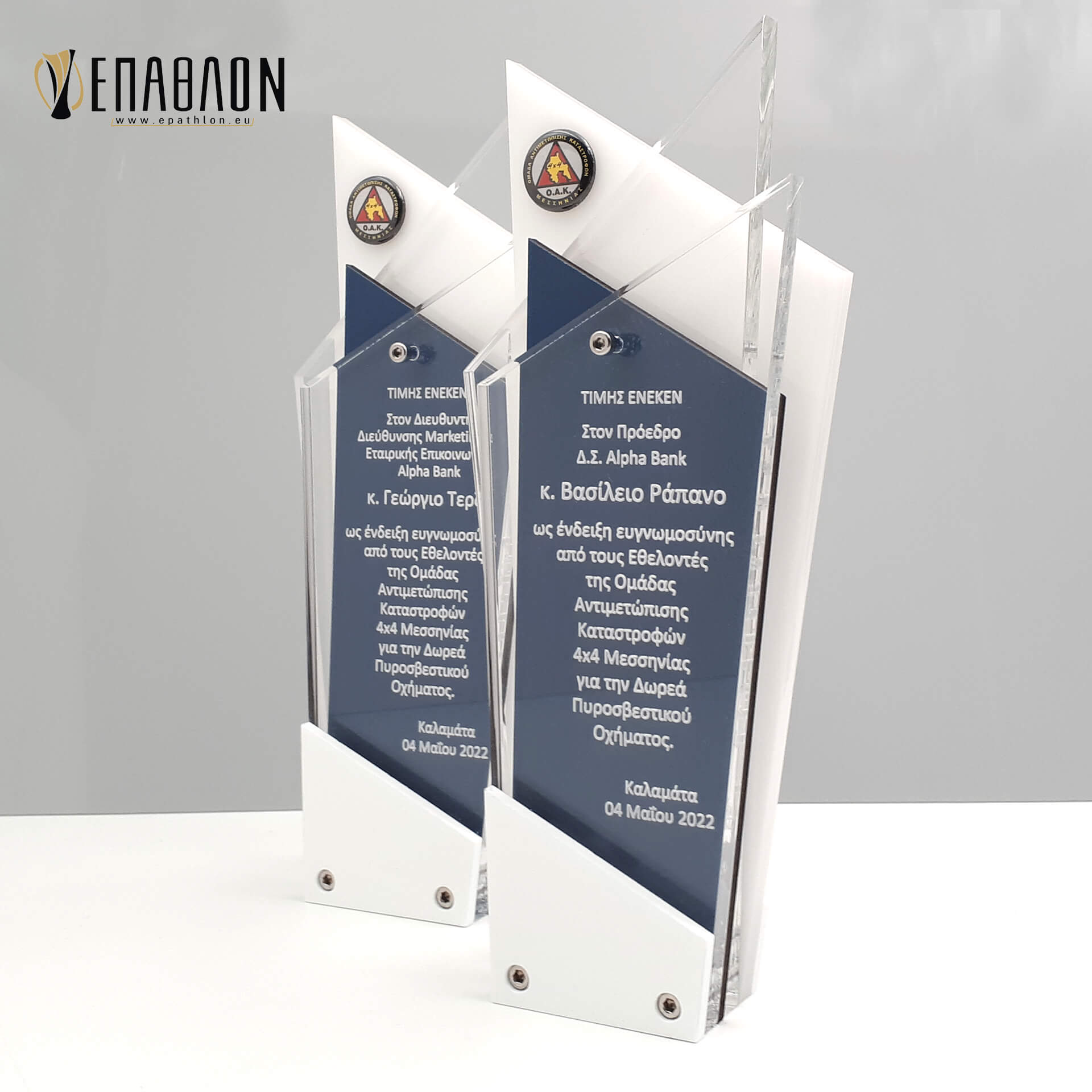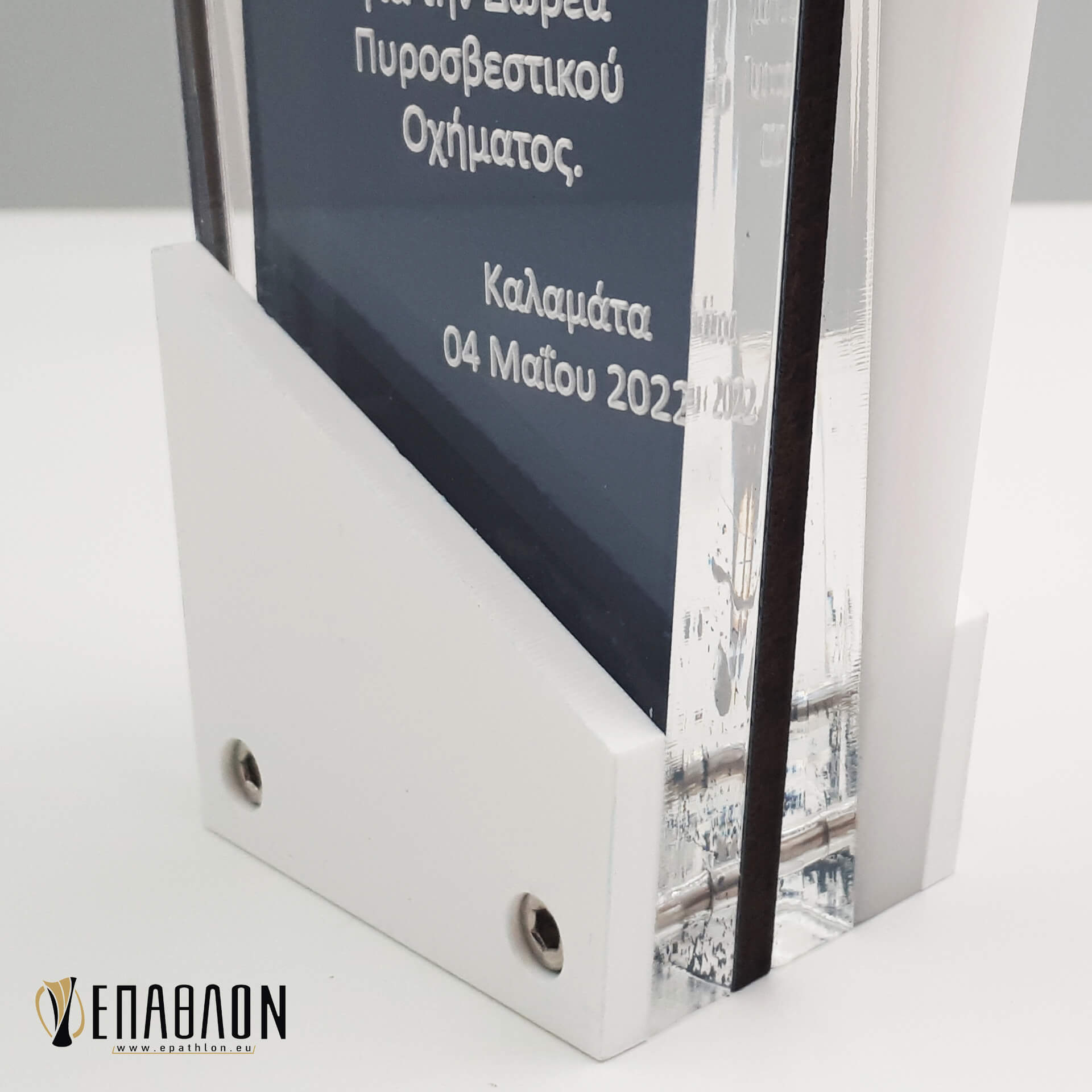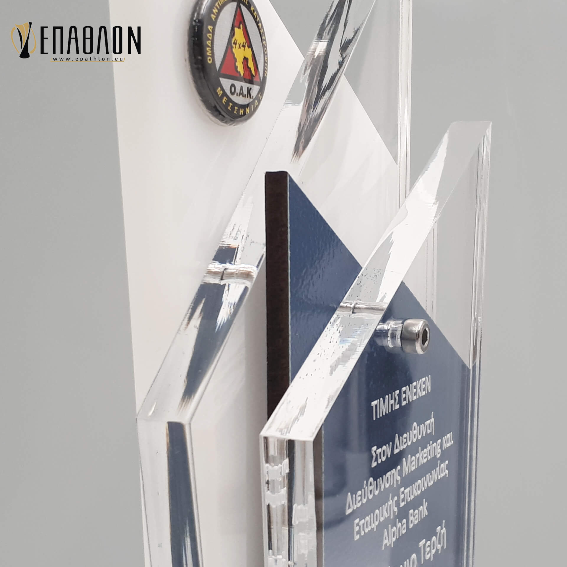 Custom αναμνηστική πλακέτα από ακρυλικό • Υλικά: Διάφανο και γαλακτερό ακρυλικό πάχους 10mm, χρωματισμένο ξύλο πάχους 4mm, λευκό ακρυλικό πάχους 5mm