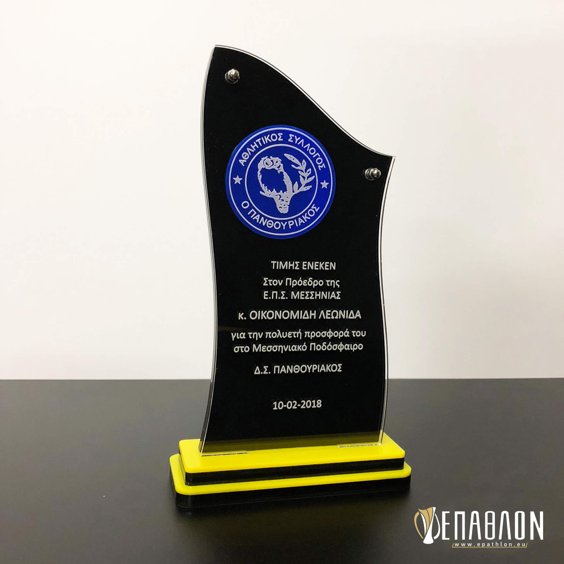 Custom αναμνηστική πλακέτα από το συνδυασμό ακρυλικών • Υλικά: Ακρυλικό διάφανο πάχους 3mm με χάραξη, μαύρο πάχους 8mm, ακρυλικό μπλε πάχους 3mm, βάσεις από μαύρο και κίτρινο ακρυλικό πάχους 3mm