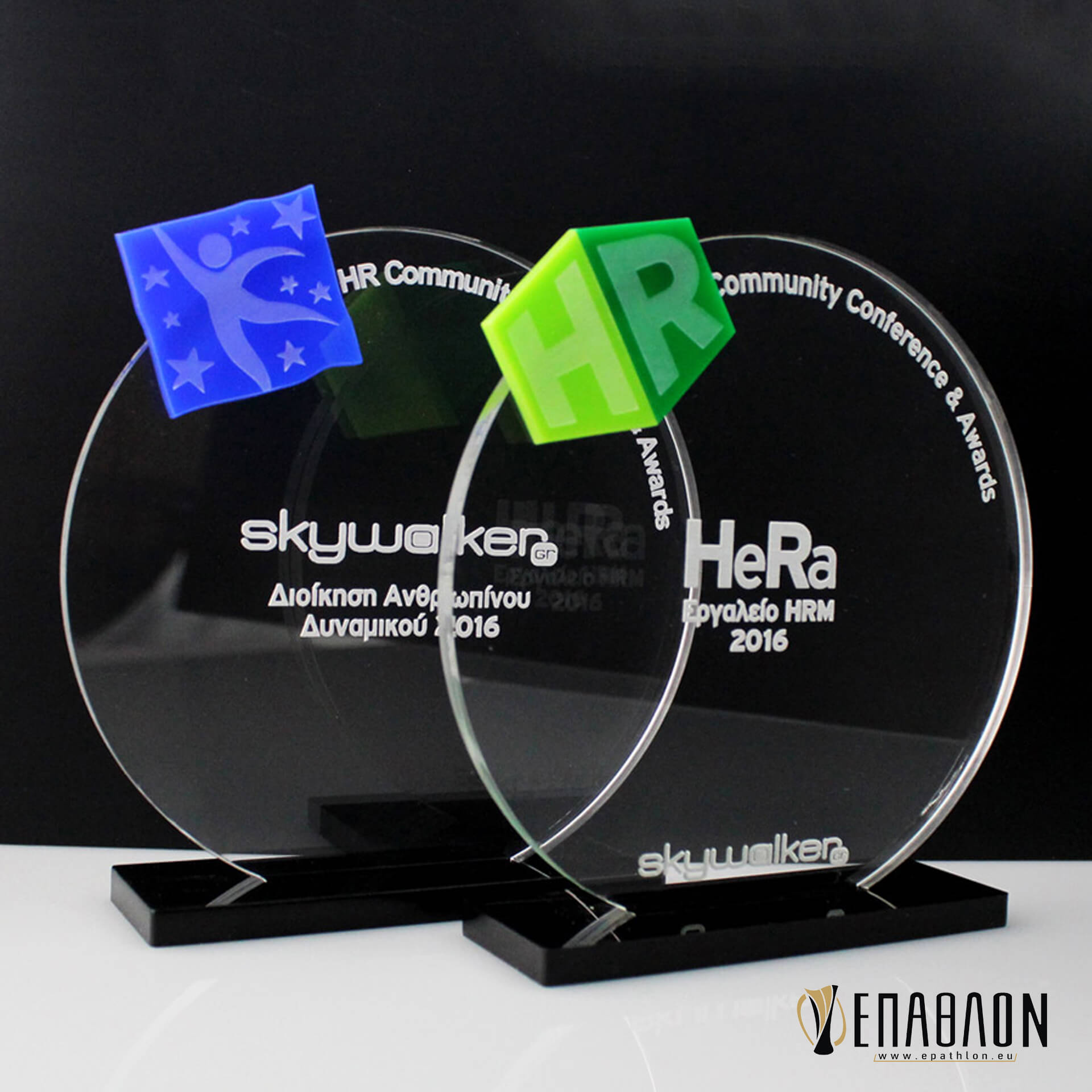 Custom αναμνηστική πλακέτα από το συνδυασμό ακρυλικών • Υλικά: Ακρυλικό διάφανο πάχους 8mm με χάραξη, μπλε-πράσινο-λαχανί ακρυλικό πάχους 3mm, βάση από μαύρο ακρυλικό