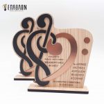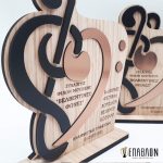 • Υλικά: Ξύλο πάχους 7mm με χάραξη, χρωματισμένο ξύλο πάχους 3mm, darwin μπρονζέ πάχους 1,5mm, βάση από ξύλο πάχους 7mm