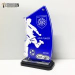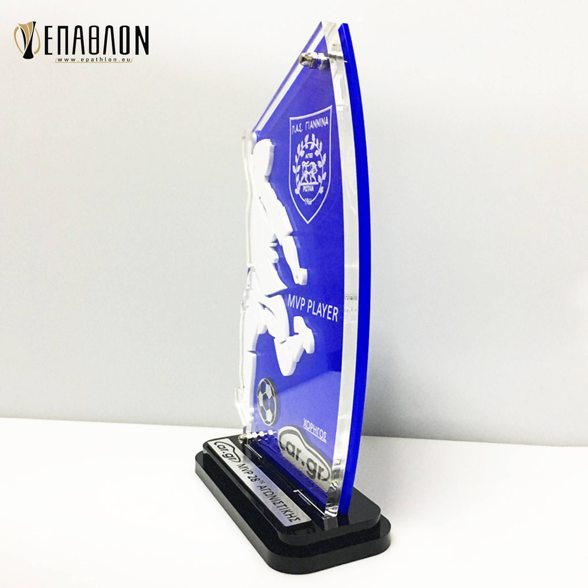 • Υλικά: Πλάτη από ακρυλικό μπλε πάχους 3mm, φιγούρα ποδοσφαιριστή από λευκό ακρυλικό πάχους 3mm, μπάλα & λογότυπο χορηγού από ασημί darwin πάχους 1,5mm και μπροστά ακρυλικό διάφανο πάχους 8mm με χάραξη. Βάσεις από μαύρο ακρυλικό