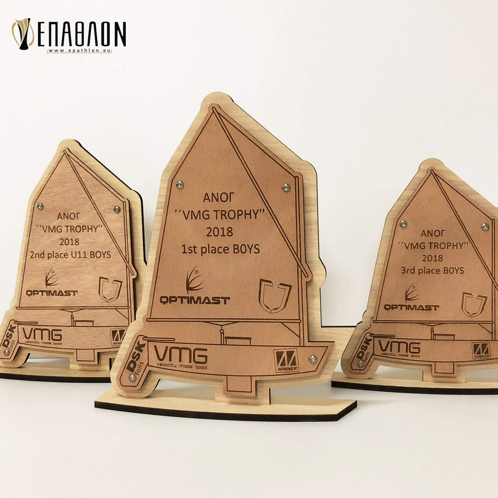 Custom έπαθλο Ιστιοπλοΐας OPTIMIST • Υλικά: Ξύλο πάχους 7mm, ξύλο πάχους 4mm με χάραξη. Βάση από ξύλο