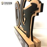 • Υλικά: Ξύλο μασίφ πάχους 5cm, μαύρο ξύλο πάχους 3mm και ψηφιακή εκτύπωση σε αυτοκόλλητο