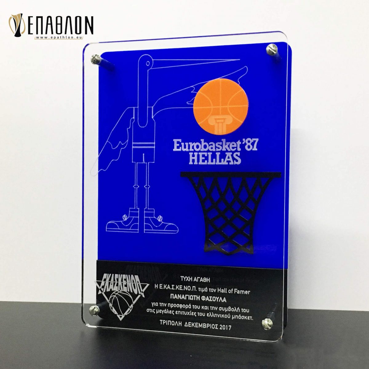 Custom έπαθλο με θέμα EUROBASKET 1987 • Υλικά: Διάφανο ακρυλικό πάχους 8mm με χάραξη, χρωματιστά ακρυλικά πάχους 3mm (μπλε, μαύρο,πορτοκαλί, πλάτη από διάφανο ακρυλικό πάχους 8mm