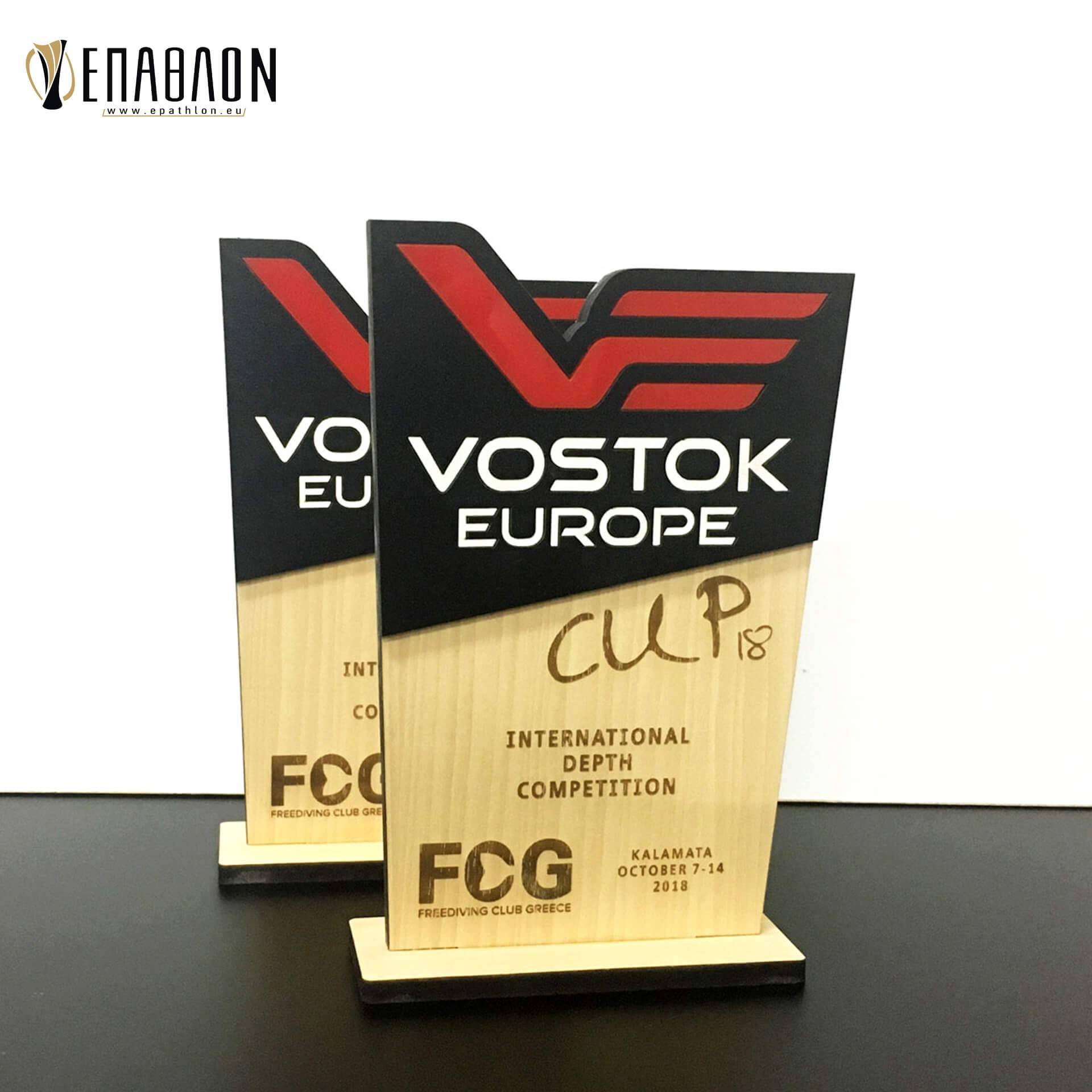 Custom έπαθλο για το “VOSTOK EUROPE CUP” • Υλικά: Πλάτη από ξύλο πάχους 7mm με χάραξη, μαύρο ξύλο πάχους 3mm,λευκό και κόκκινο ακρυλικό πάχους 3mm