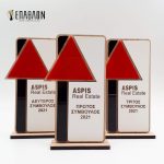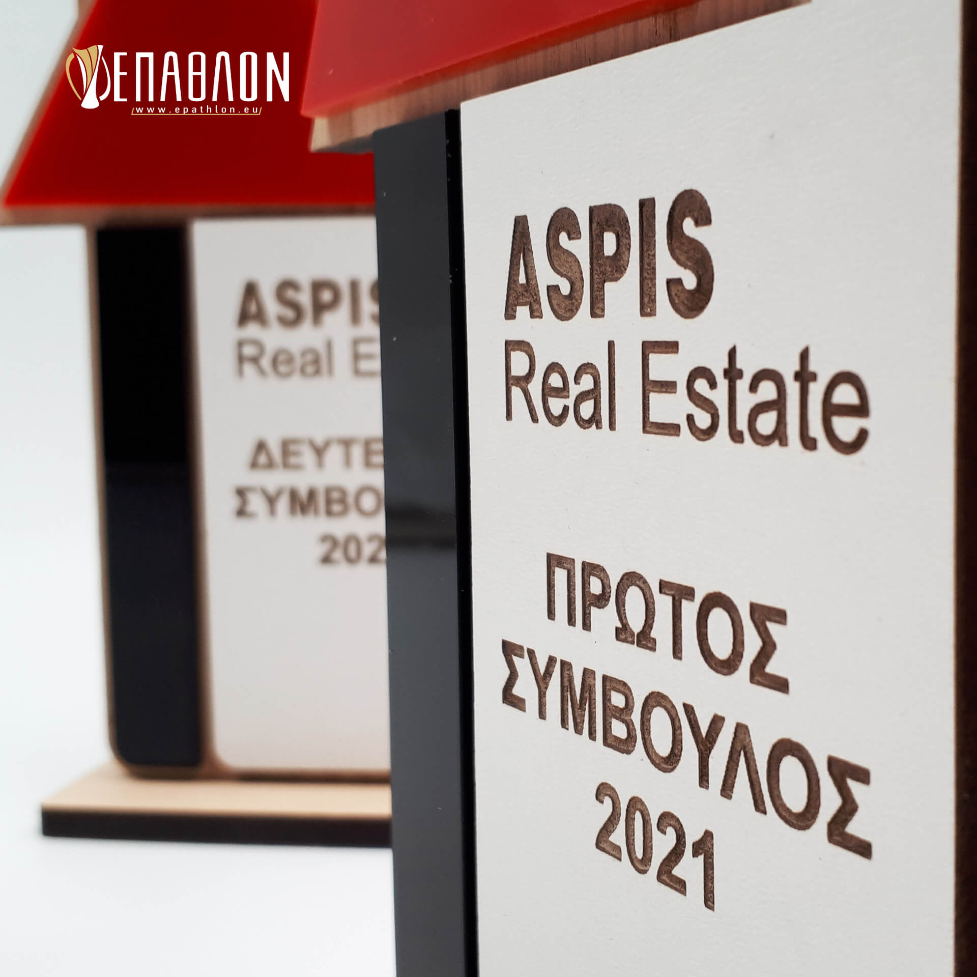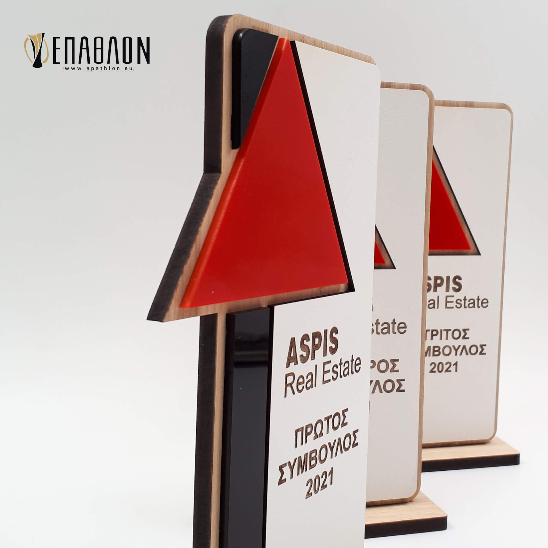 Custom βραβείο για τους συνεργάτες της ASPIS REAL ESTATE Διάσταση 20x12cm • Υλικά: Ξύλο δρυς πάχους 7mm, λευκό ξύλο πάχους 3mm, μαύρο και κόκκινο ακρυλικό πάχους 3mm