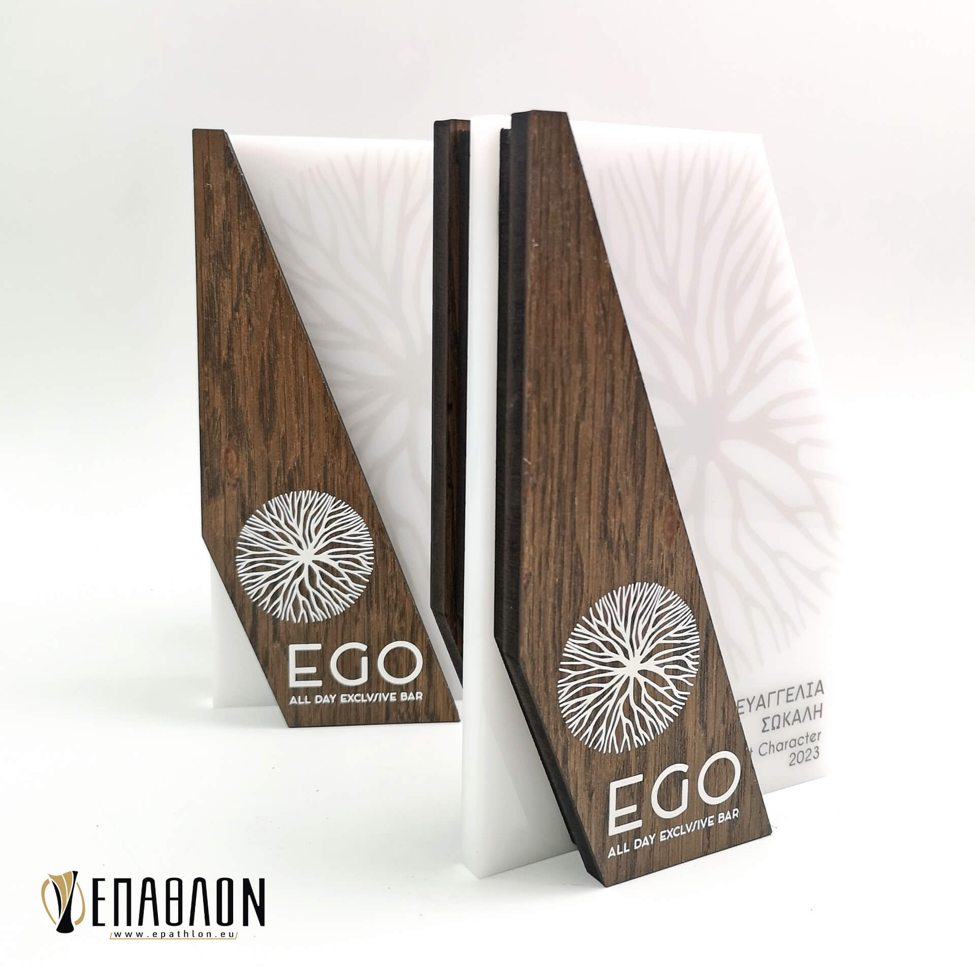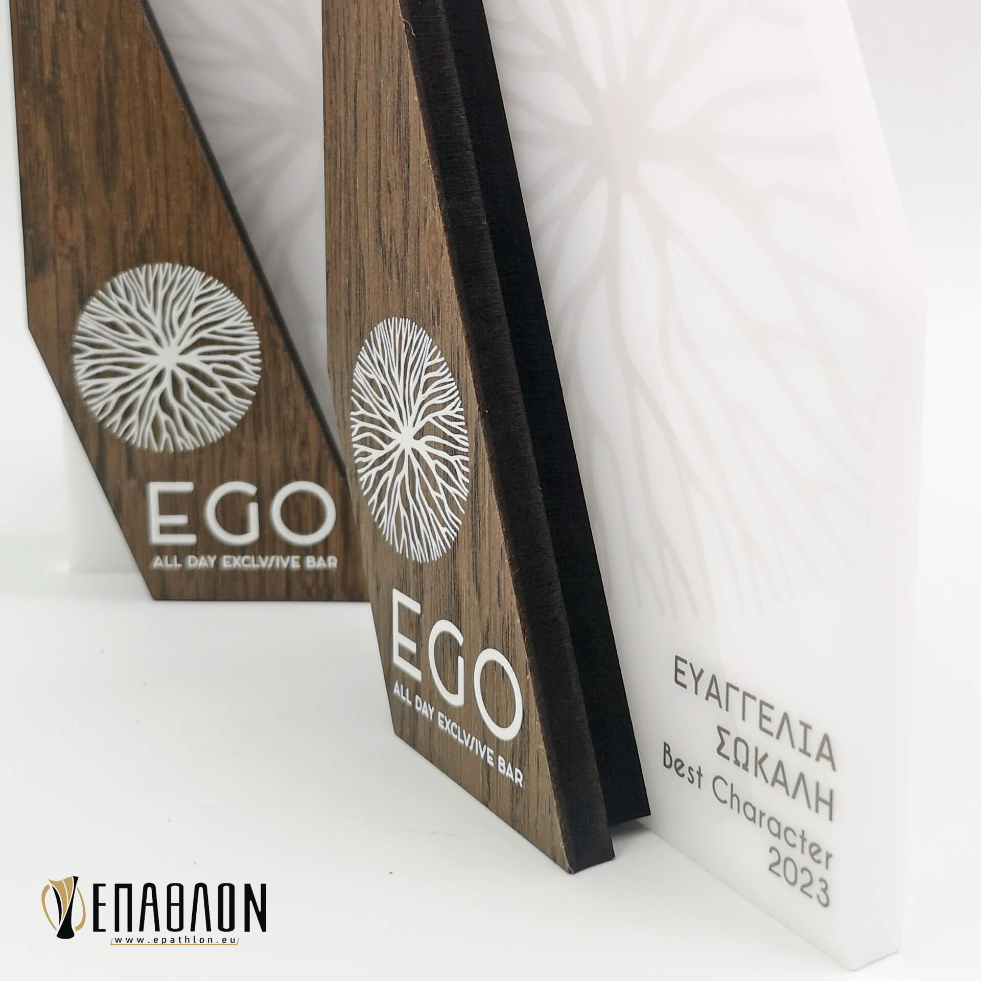 Custom βραβείο για τους καλύτερους υπαλλήλους στο EGO All Day Exclusive Bar • Υλικά: Plexiglass γαλακτερό πάχους 10mm με εκτύπωση επάνω στο υλικό, ξύλο πάχους 9mm (μπροστά & πίσω) με εκτύπωση επάνω στο υλικό