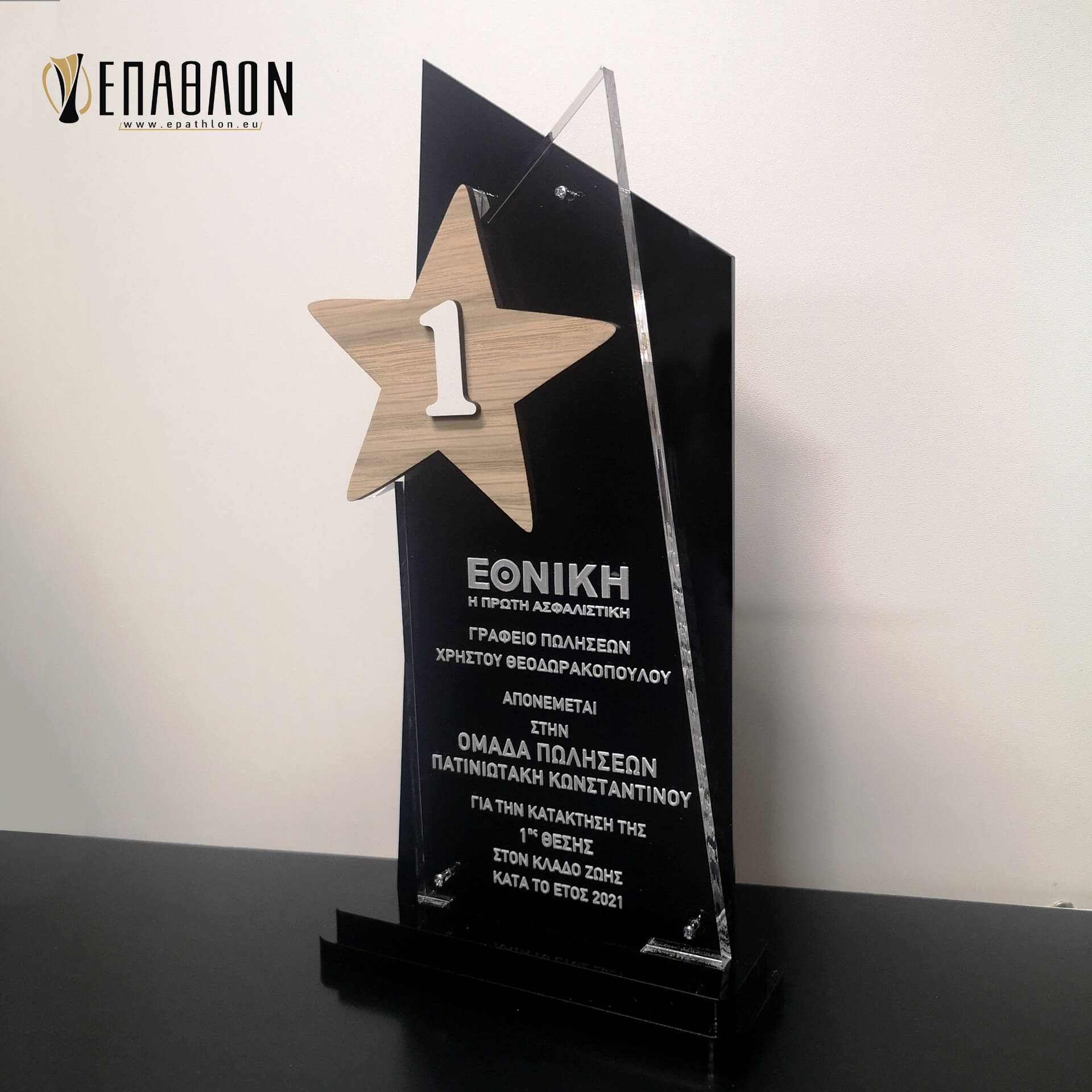 • Υλικά: Μαύρο ακρυλικό πάχους 3mm, διάφανο ακρυλικό πάχους 8mm με χάραξη, ξύλο πάχους 4mm, λευκό ξύλο πάχους 3mm, βάση από μαύρο ακρυλικό πάχους 8mm