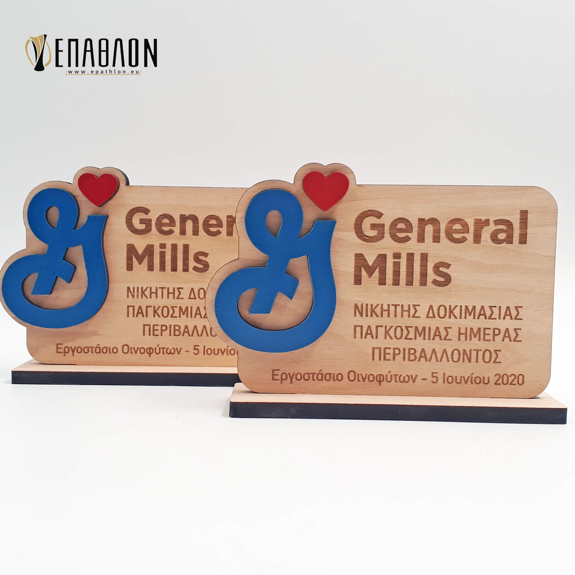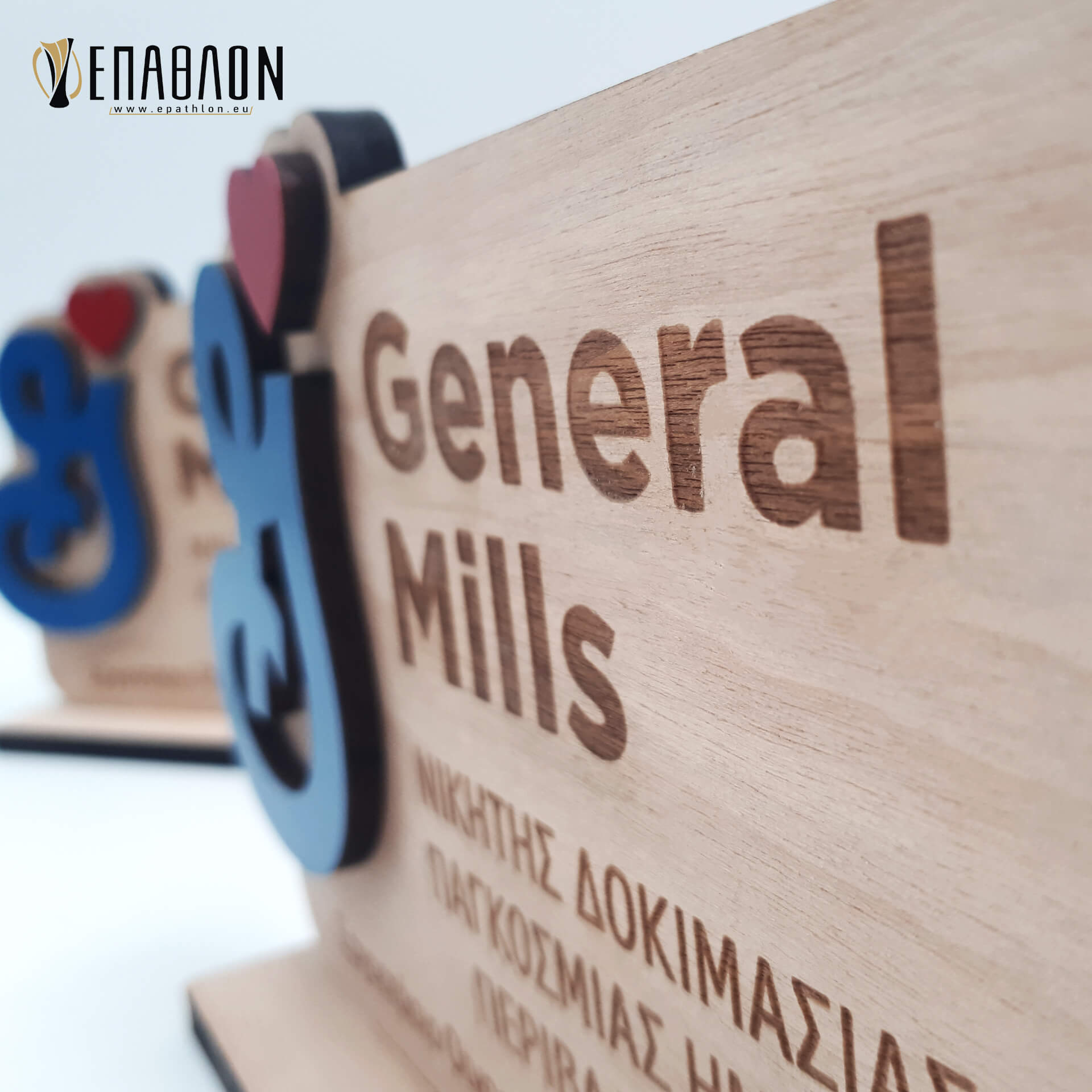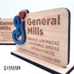 Custom βραβείο για τους συνεργάτες της GENERAL MILLS Διάσταση 15x10cm • Υλικά: Ξύλο πάχους 7mm με χάραξη, κόκκινο και μπλε ξύλο πάχους 3mm, βάση από ξύλο πάχους 7mm