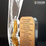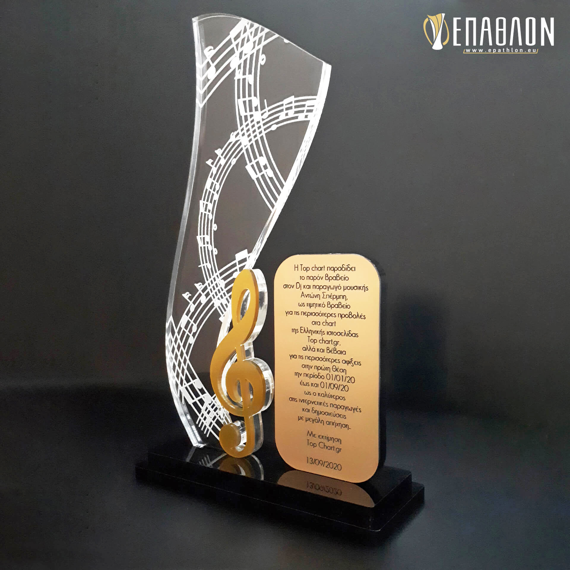 Custom βραβείο με μουσικό θέμα Διάσταση 25x14cm • Υλικά: Διάφανο ακρυλικό πάχους 6mm, χρυσό ακρυλικό πάχους 3mm, darwin χρυσό πάχους 1,5mm