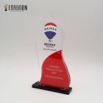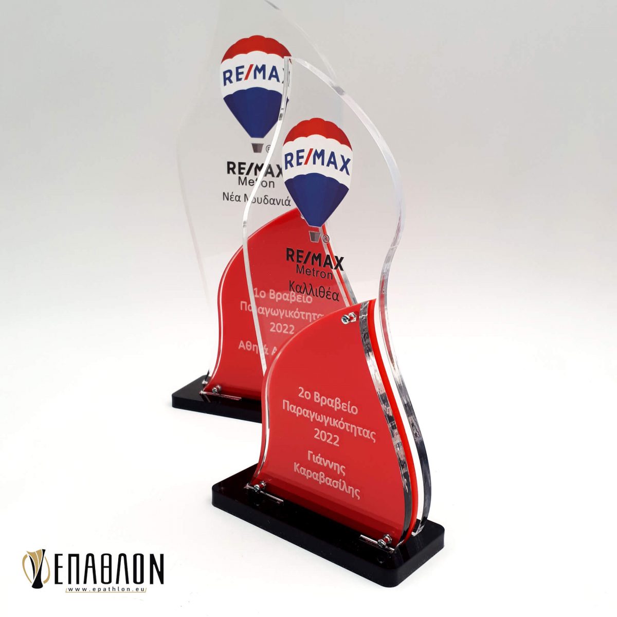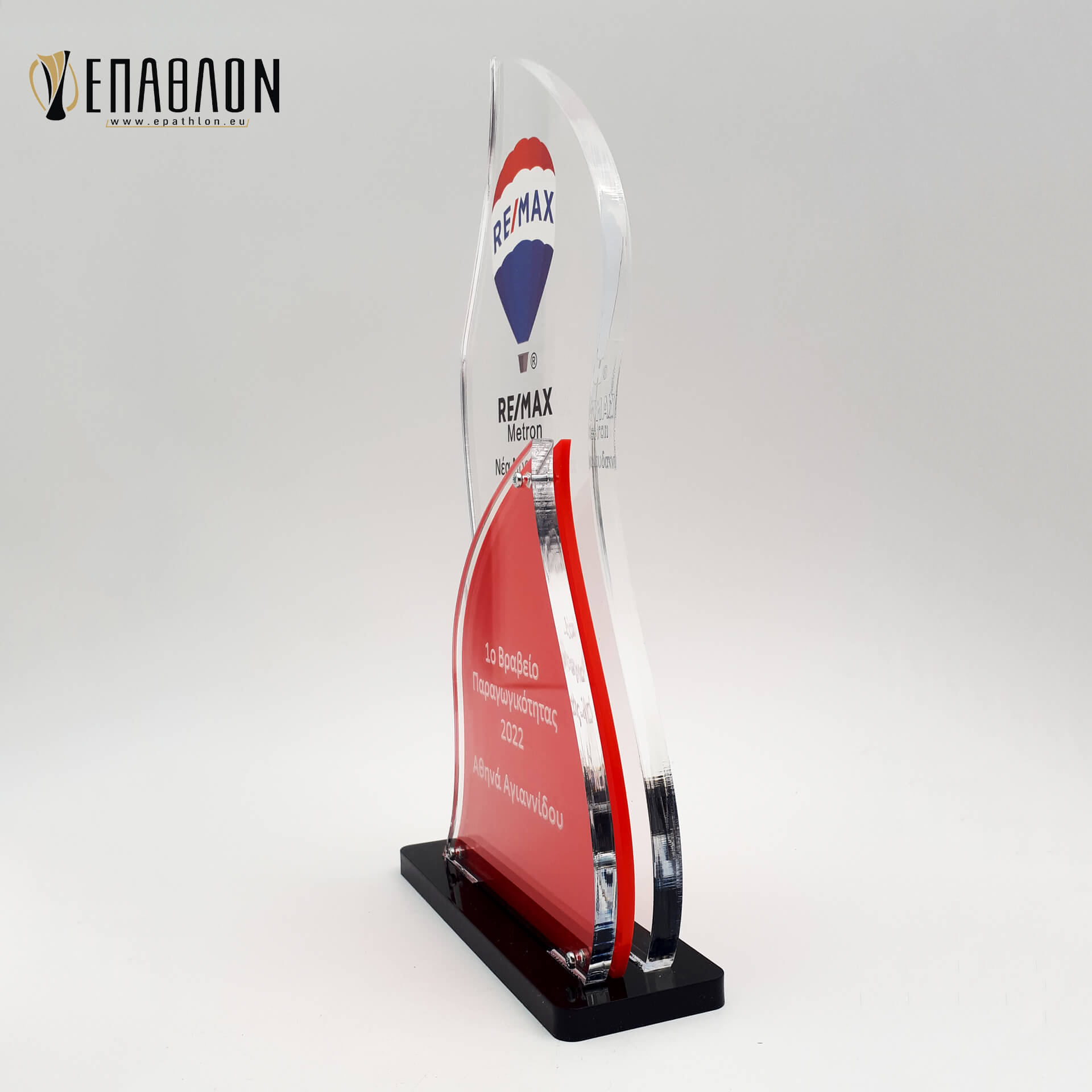 Custom βραβείο για τους συνεργάτες της REMAX • Υλικά: Plexiglass διάφανο πάχους 8mm με εκτύπωση επάνω στο υλικό, μπροστά plexiglass κόκκινο πάχους 3mm & plexiglass διάφανο πάχους 6mm με χάραξη το κείμενο