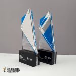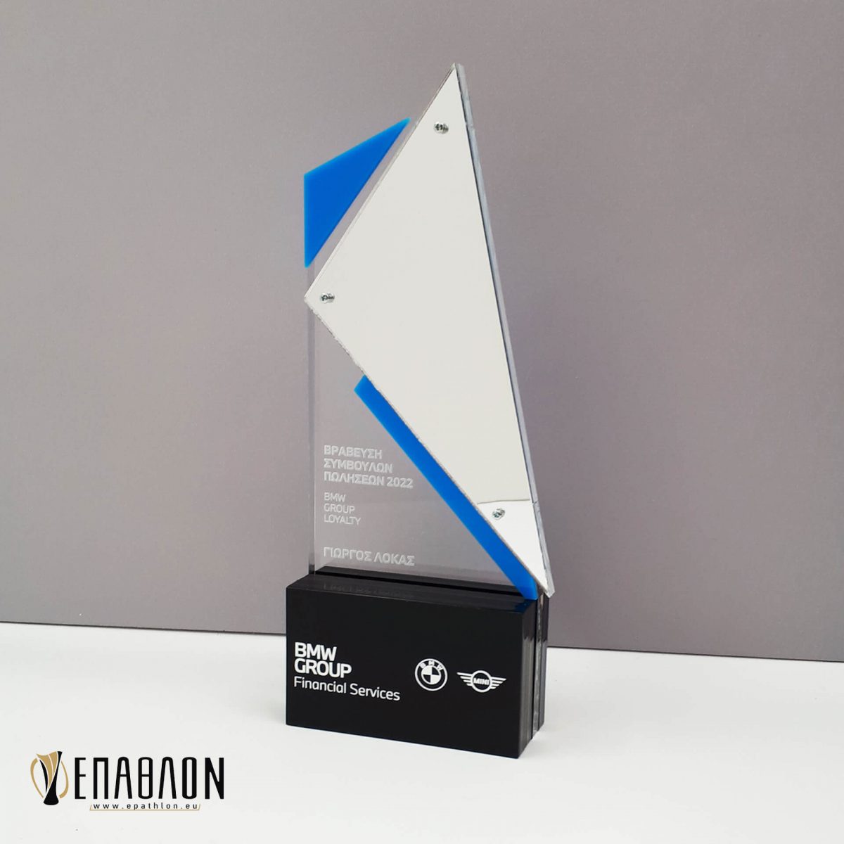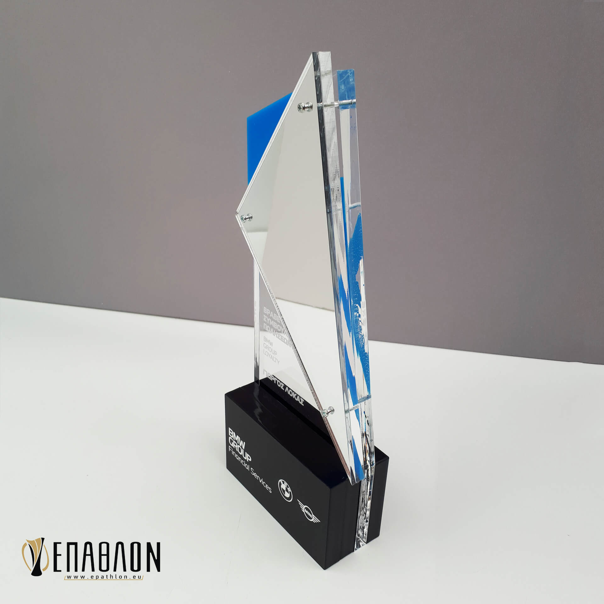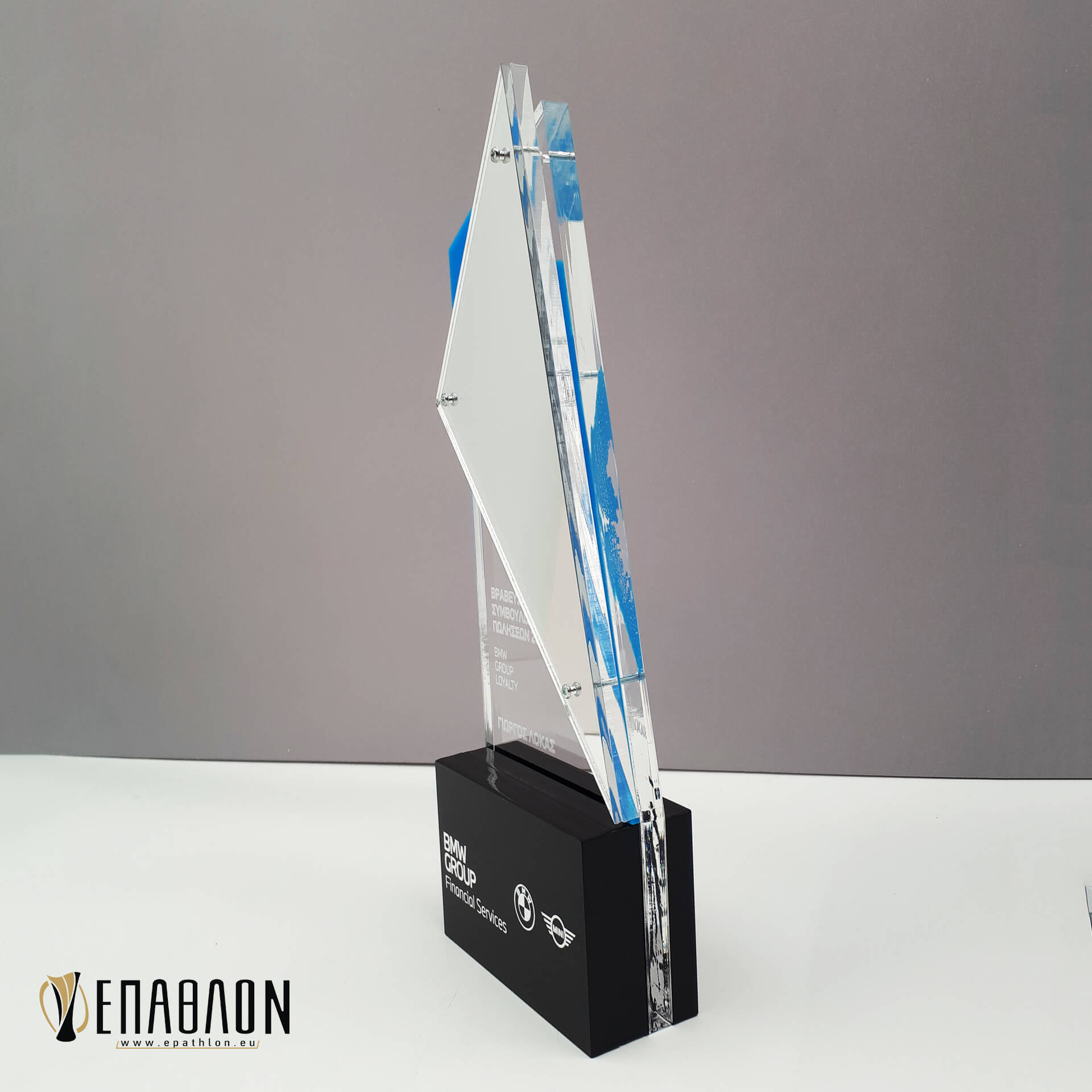 • Υλικά: Plexiglass διάφανο πάχους 10mm με χάραξη το κείμενο, γαλάζιο Plexiglass πάχους 3mm, διάφανο Plexiglass πάχους 6mm, Plexiglass καθρέπτης ασημί, βάση από μαύρα Plexiglass πάχους 10mm με εκτύπωση επάνω στο υλικό