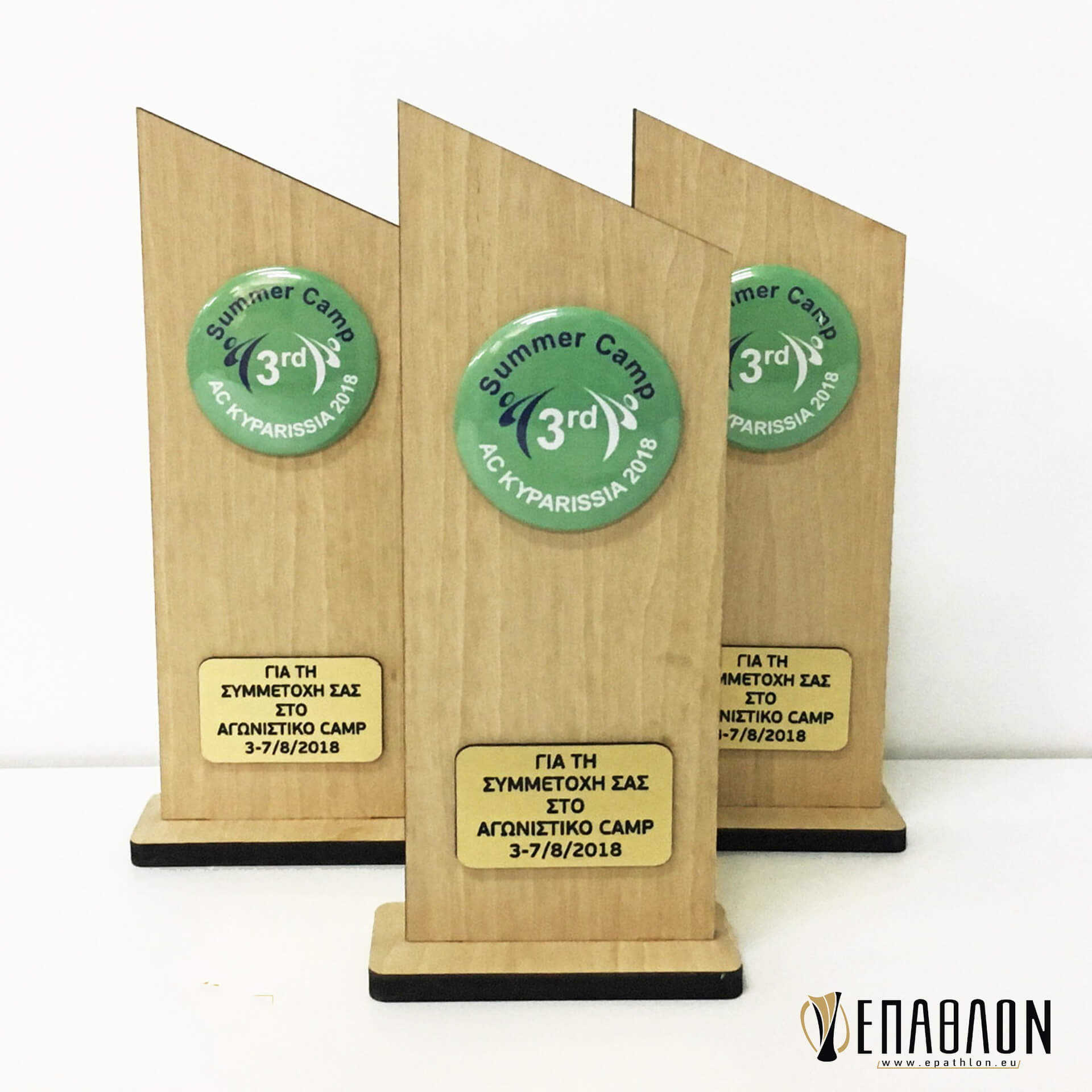 Custom αναμνηστική πλακέτα από ξύλο • Υλικά: Ξύλο πάχους 7mm, λογότυπο σε κονκάρδα, ταμπελάκι από χρυσό darwin με χάραξη