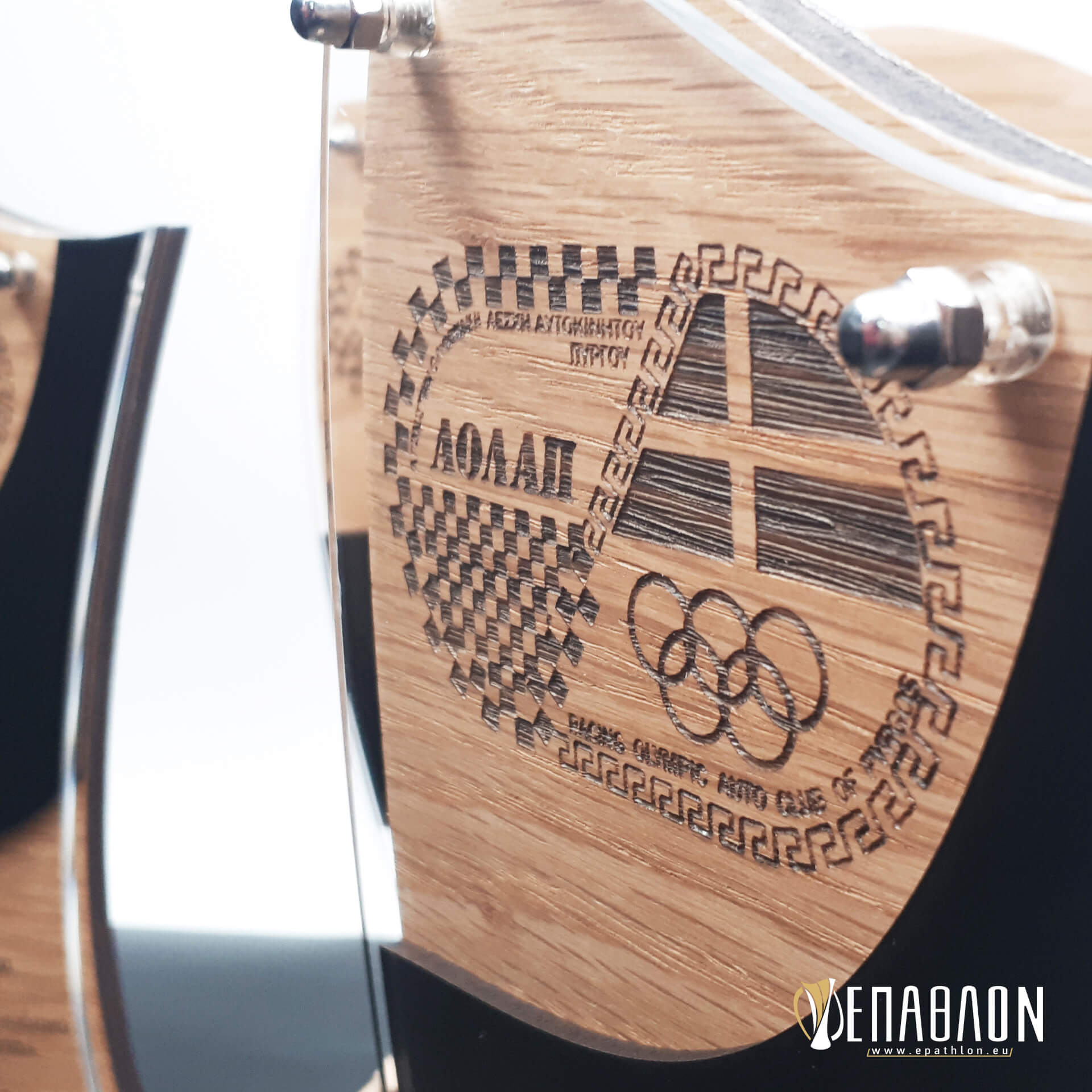 Custom αναμνηστική πλακέτα από το συνδυασμό ξύλων και ακρυλικού • Υλικά: Ξύλο πάχους 7mm με χάραξη, μαύρο ξύλο πάχους 3mm, διάφανο ακρυλικό πάχους 3mm, βάσεις από ξύλο