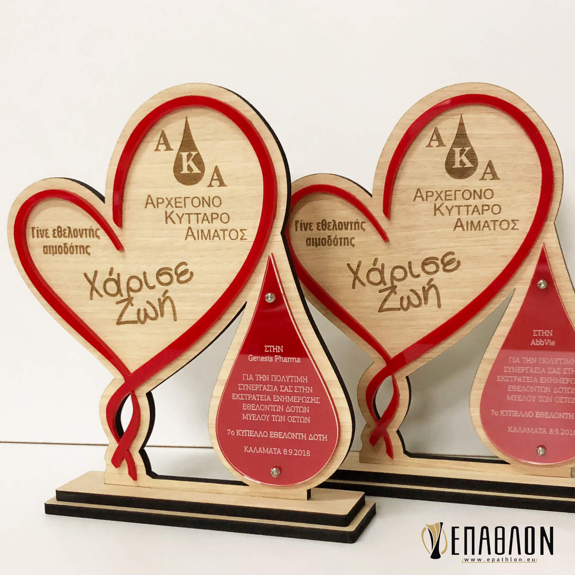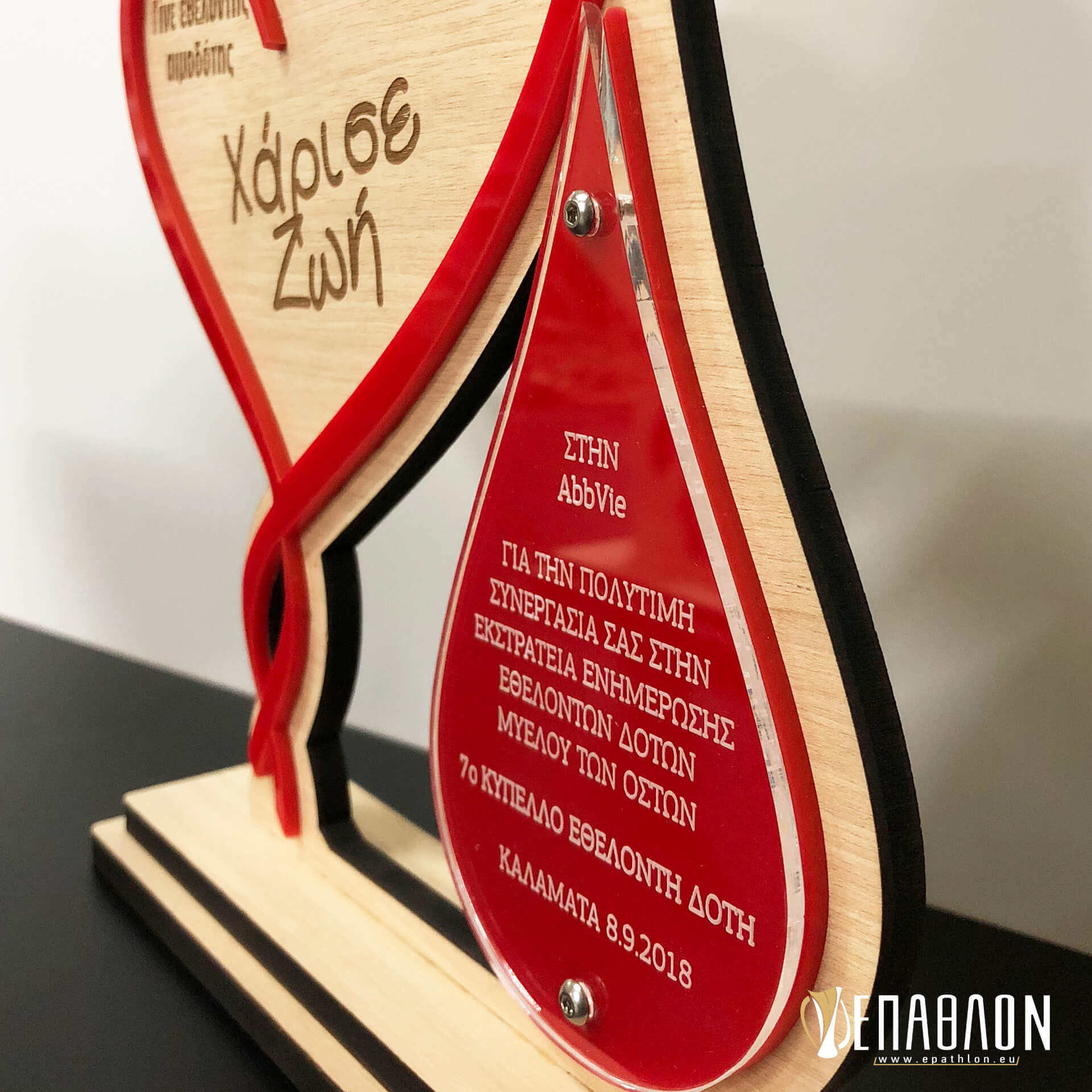 Custom αναμνηστική πλακέτα από το συνδυασμό ξύλου και ακρυλικών • Υλικά: Ξύλο πάχους 7mm με χάραξη, κόκκινο ακρυλικό πάχους 3mm, διάφανο ακρυλικό πάχους 3mm με χάραξη