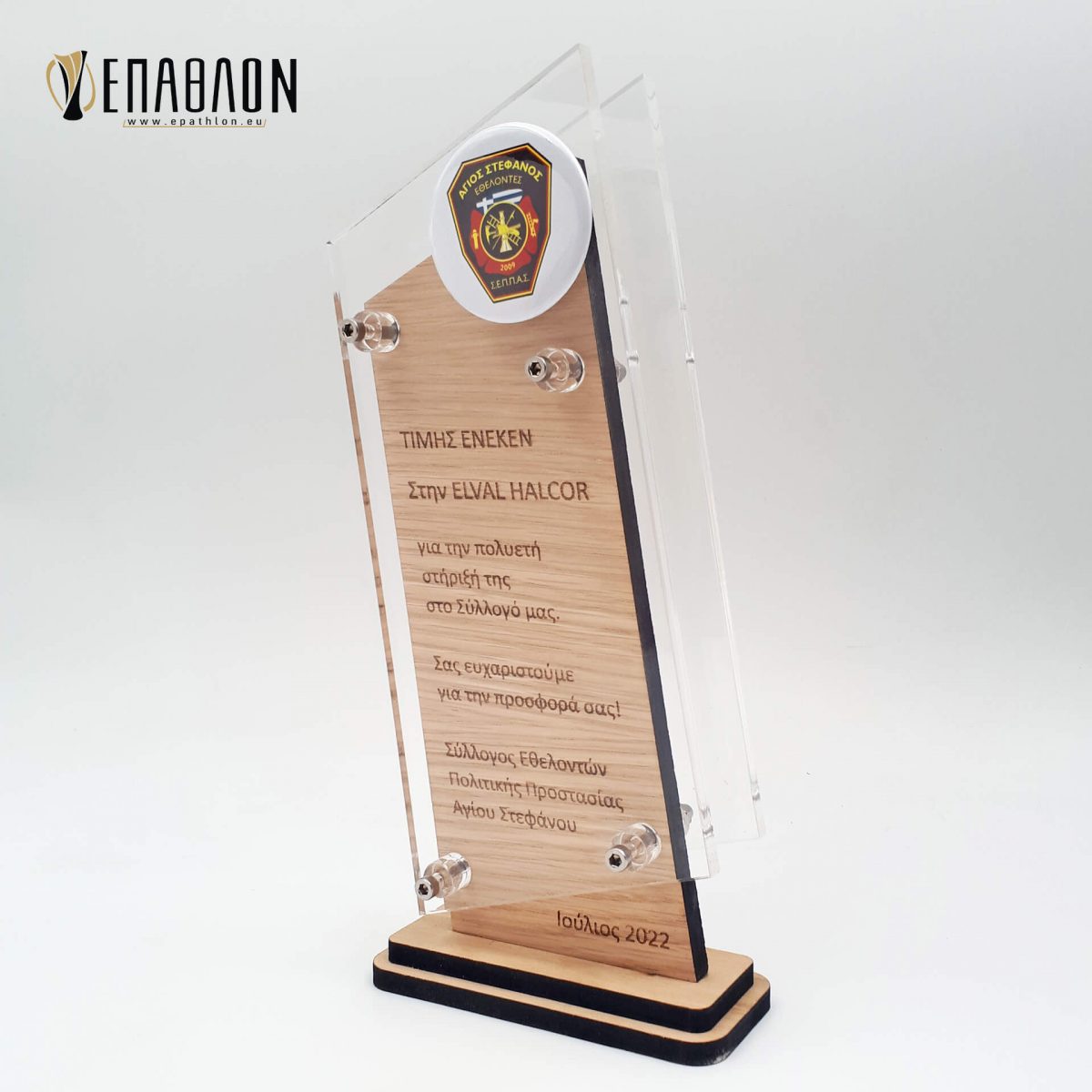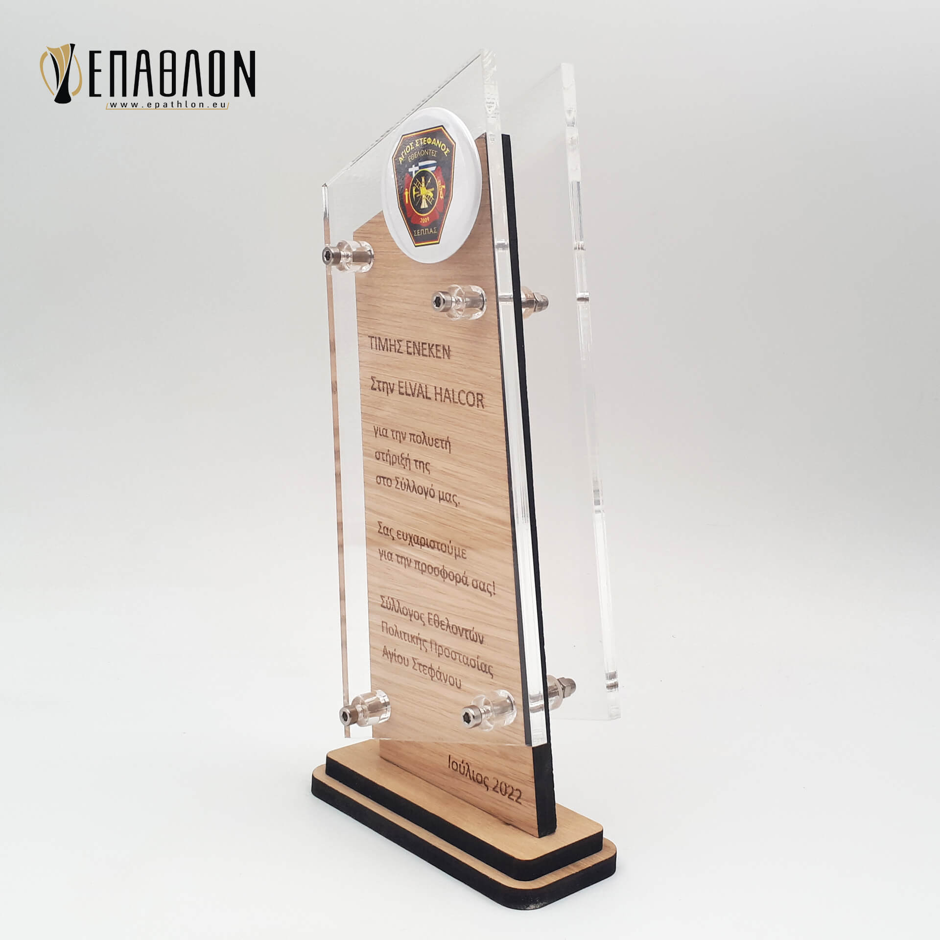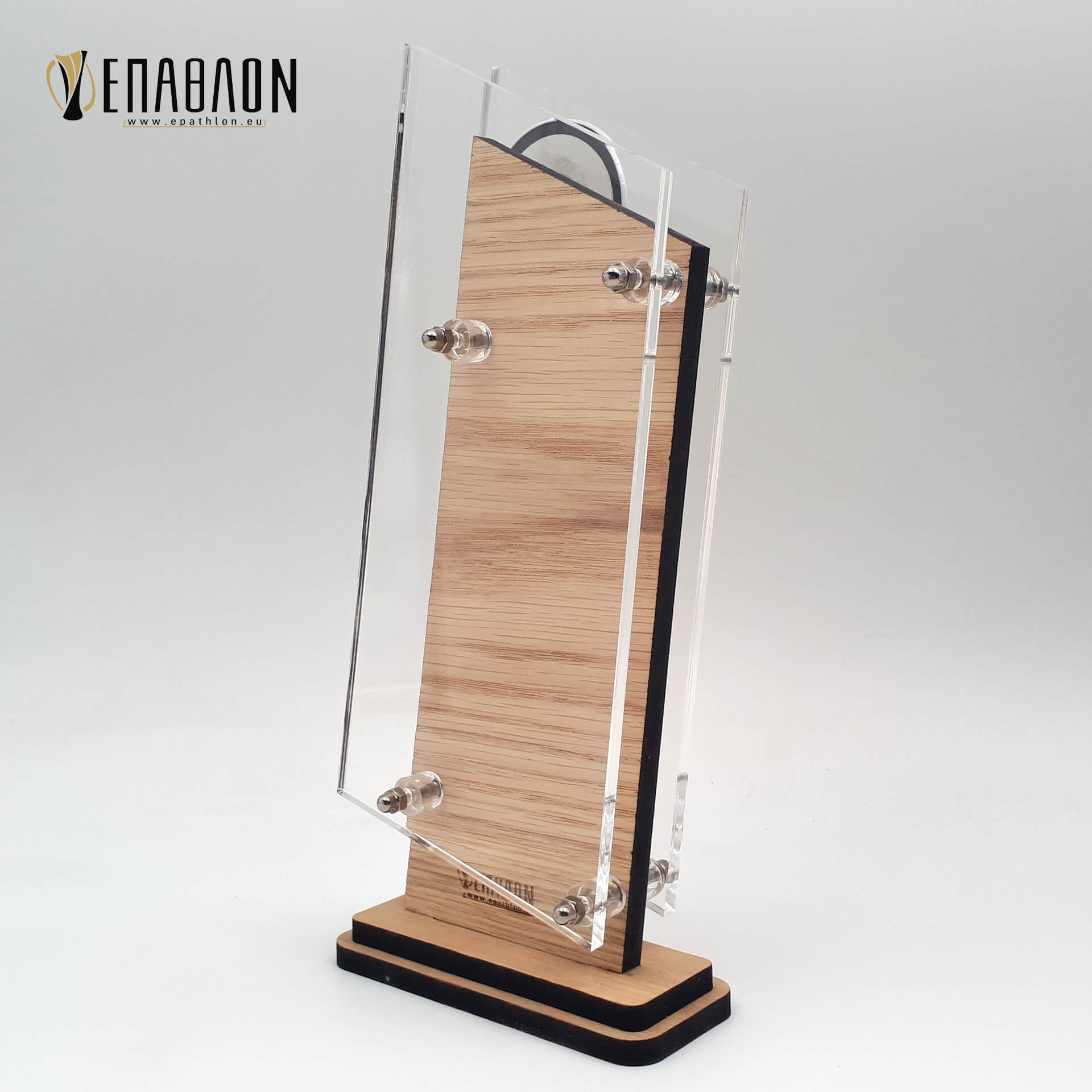 Custom αναμνηστική πλακέτα από το συνδυασμό ξύλων και ακρυλικού • Διάσταση: 26x12cm • Υλικά: Ξύλο πάχους 9mm, διάφανο ακρυλικό πάχους 6mm, λογότυπο σε κονκάρδα