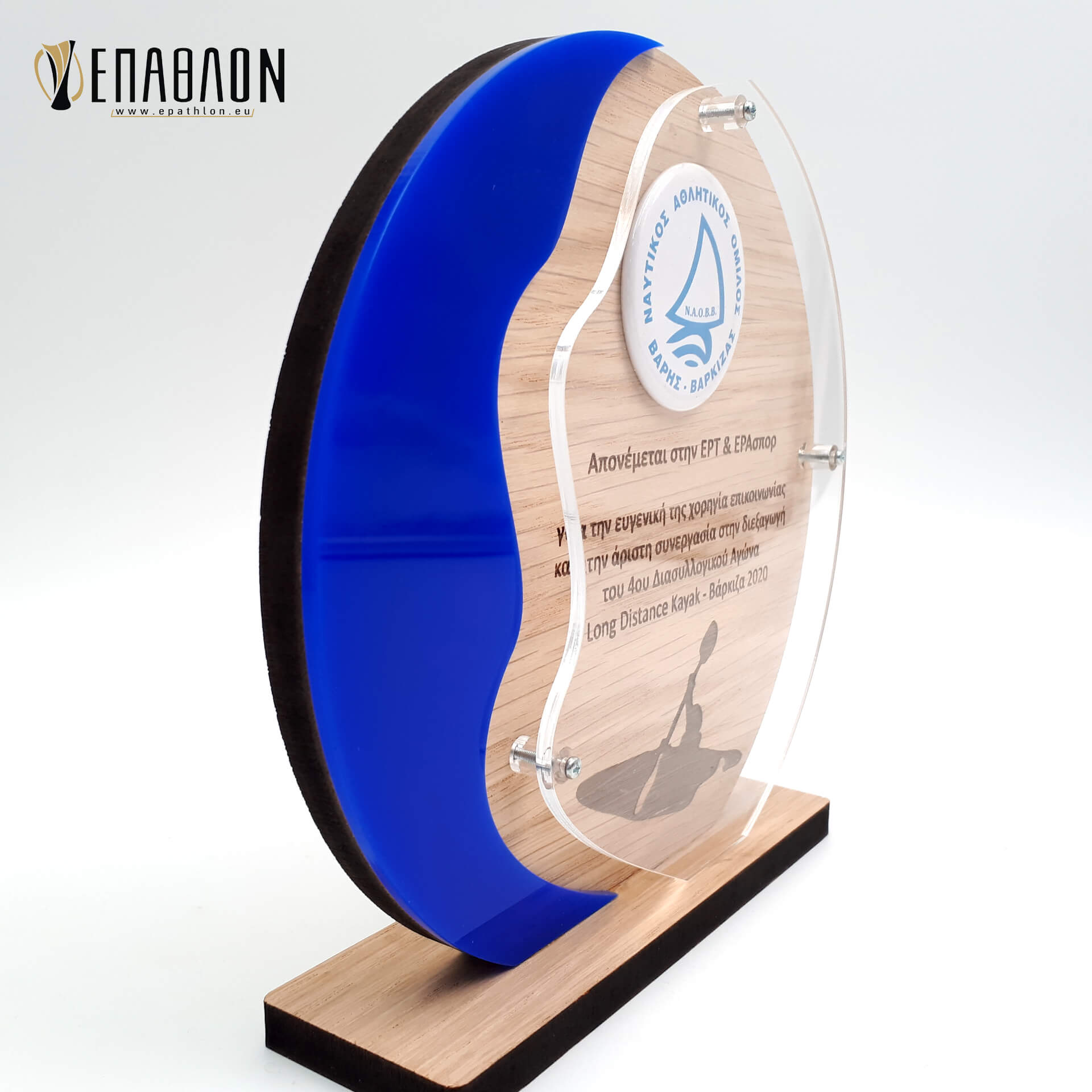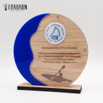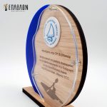 Custom αναμνηστική πλακέτα από το συνδυασμό ξύλων και ακρυλικού • Διάσταση: 18x18cm • Υλικά: Πλάτη από ξύλο πάχους 9mm με χάραξη, χρωματισμένο ξύλο πάχους 3mm, διάφανο ακρυλικό πάχους 3mm, βάση από ξύλο