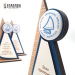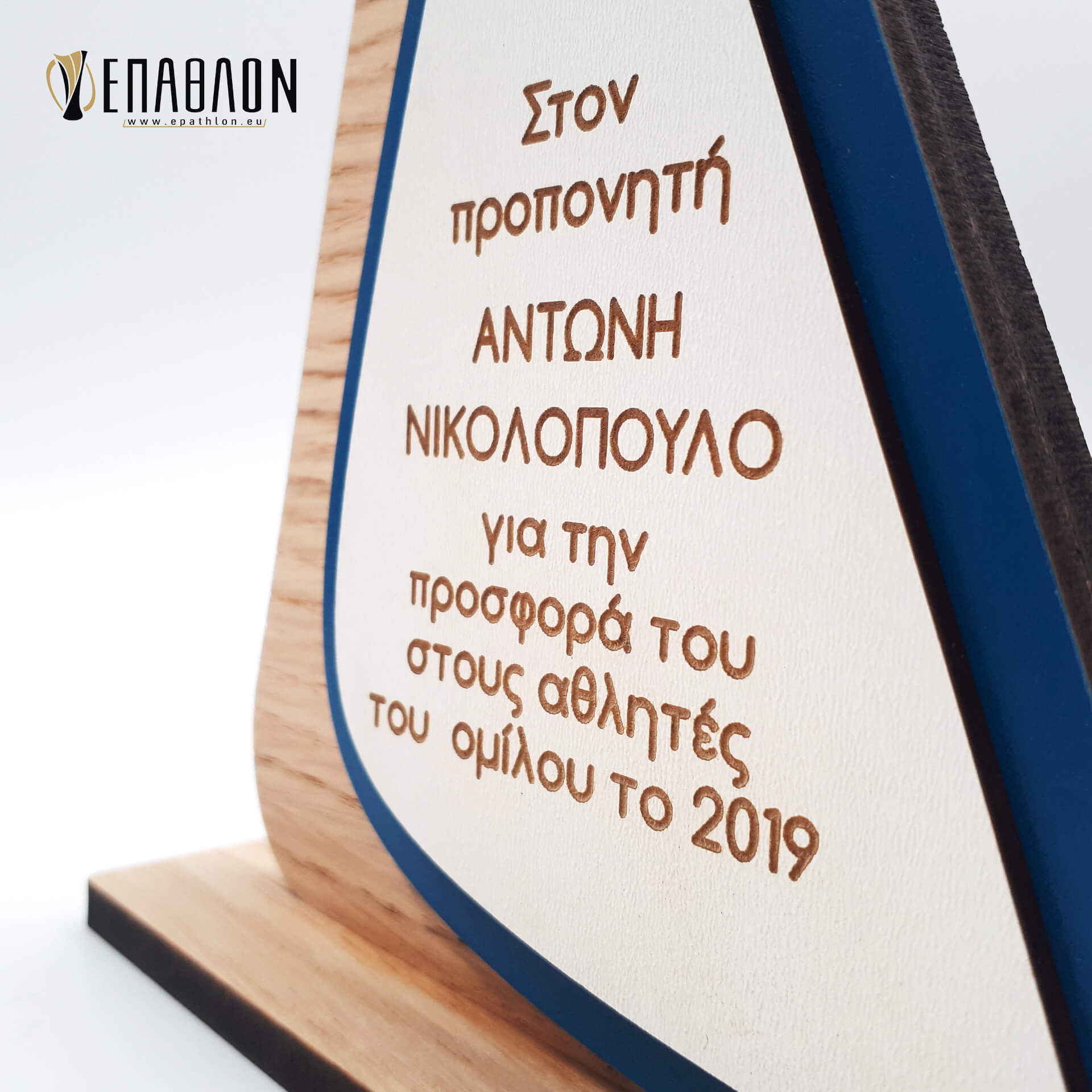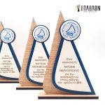 Custom αναμνηστική πλακέτα από το συνδυασμό ξύλων • Διάσταση: 22x15cm • Υλικά: Πλάτη από ξύλο πάχους 7mm, χρωματισμένο ξύλο πάχους 4mm, λευκό λακαριστό ξύλο πάχους 3mm με χάραξη, λογότυπο σε κονκάρδα