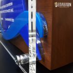 • Υλικά: Πλάτη από μασίφ ξύλο πάχους 5cm, μπλε και γαλάζιο ακρυλικό πάχους 3mm, διάφανο ακρυλικό πάχους 8mm με χάραξη λογότυπα και κείμενο