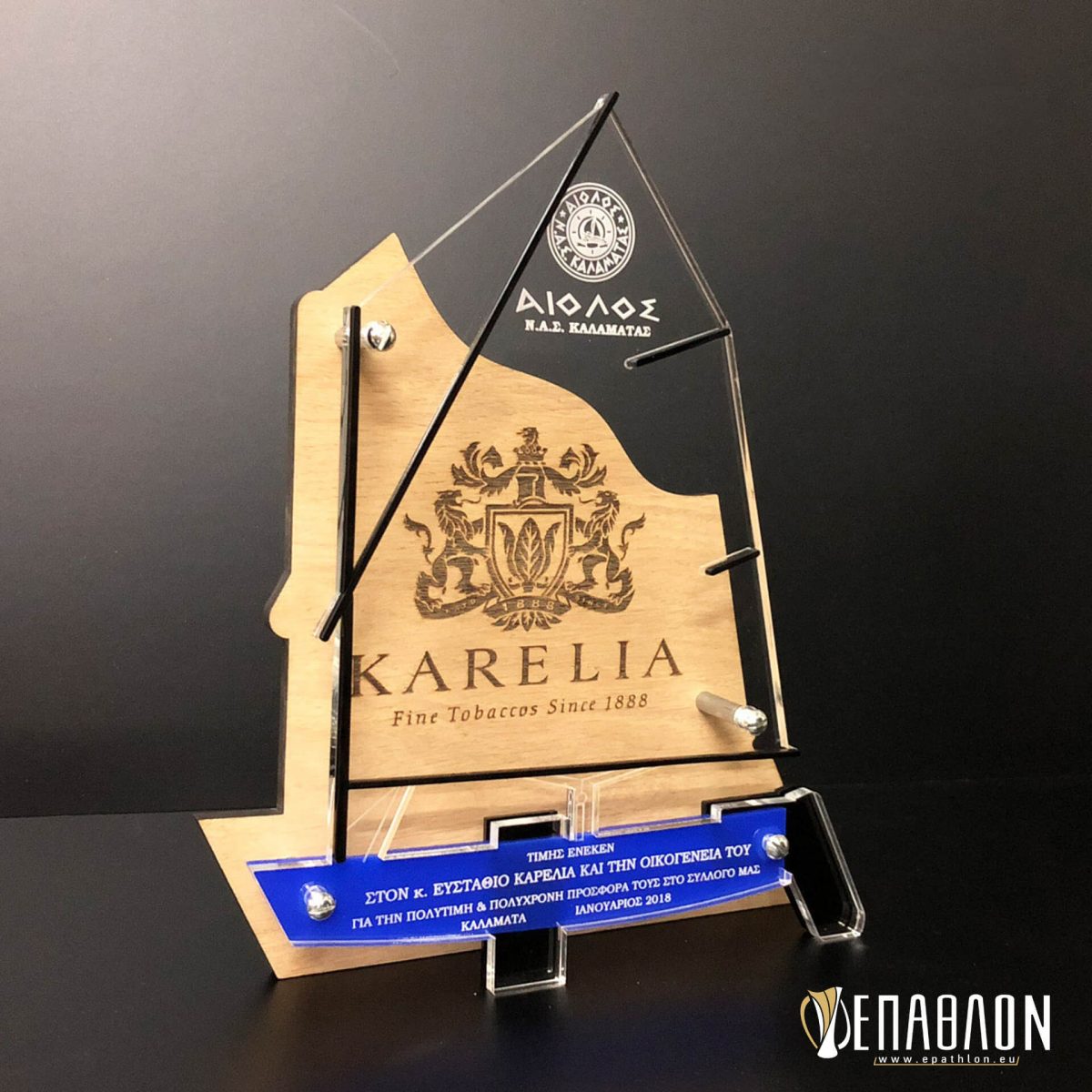 Custom αναμνηστική πλακέτα με θέμα Ιστιοπλοΐας σε σχήμα σκάφους OPTIMIST • Υλικά: Ξύλο πάχους 7mm με χάραξη, μπλε και μαύρο ακρυλικό πάχους 3mm, διάφανο ακρυλικό πάχους 6mm με χάραξη