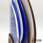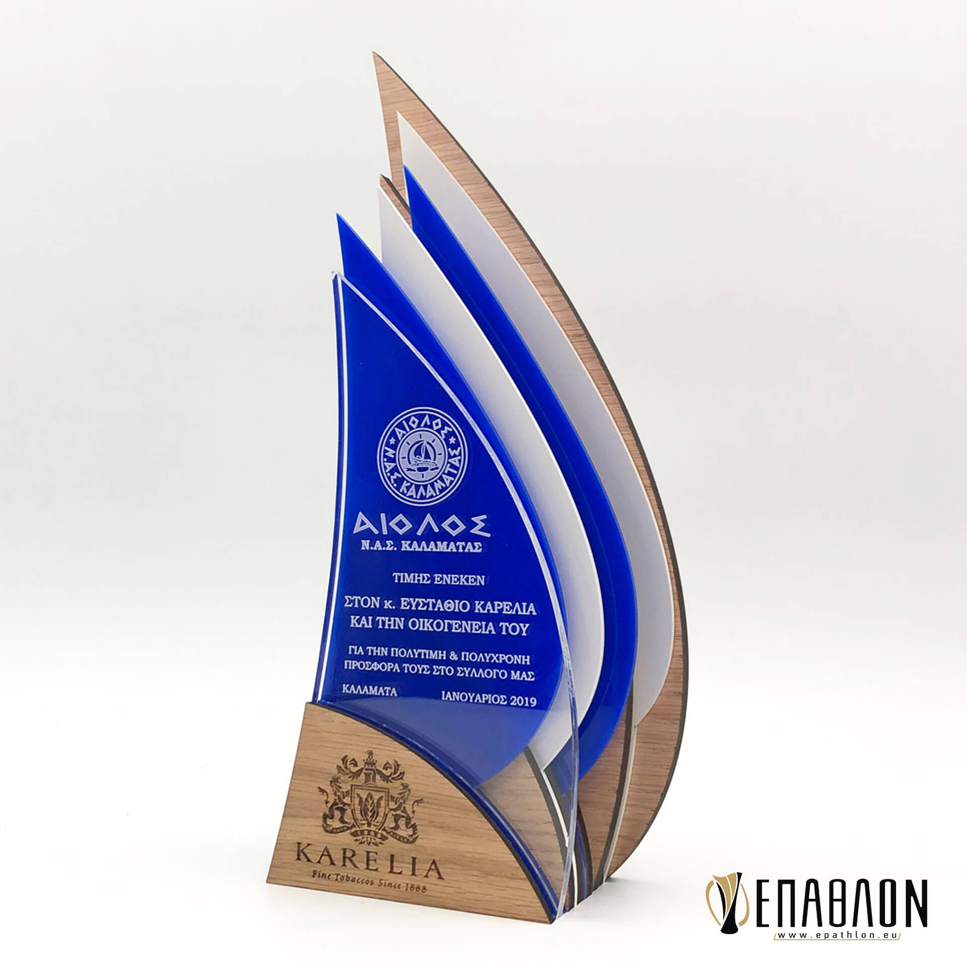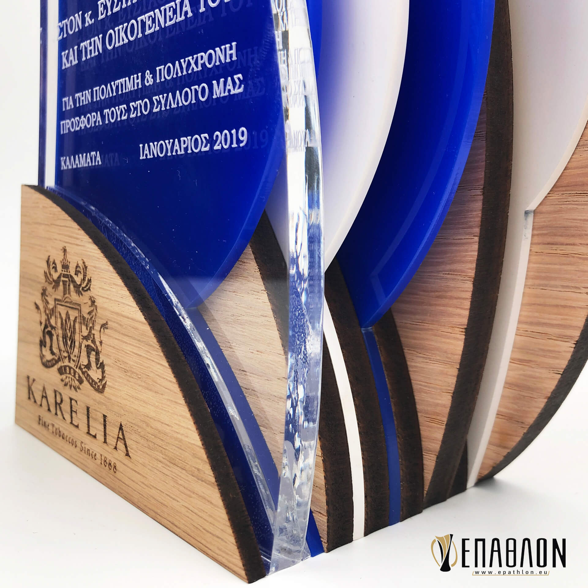Custom αναμνηστική πλακέτα από το συνδυασμό ξύλου και ακρυλικού • Υλικά: Ξύλο πάχους 9mm με χάραξη, λευκό και μπλε ακρυλικό πάχους 3mm, διάφανο ακρυλικό πάχους 8mm με χάραξη