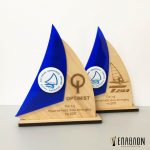 Custom αναμνηστική πλακέτα από το συνδυασμό ξύλου και ακρυλικού • Υλικά: Ξύλο πάχους 7mm με χάραξη, μπλε ξύλο πάχους 3mm, λογότυπο σε κονκάρδα, βάση από ξύλο