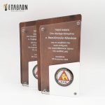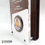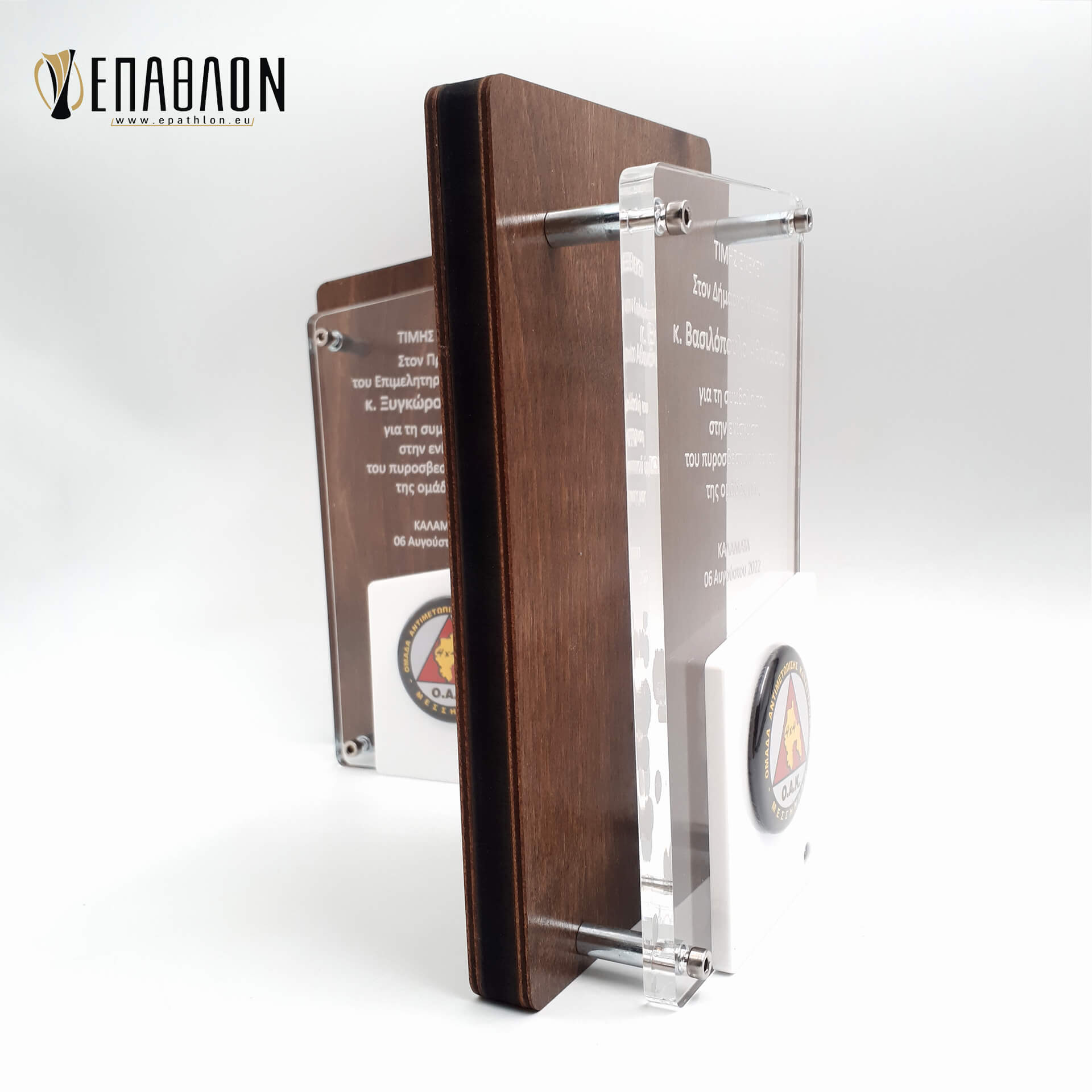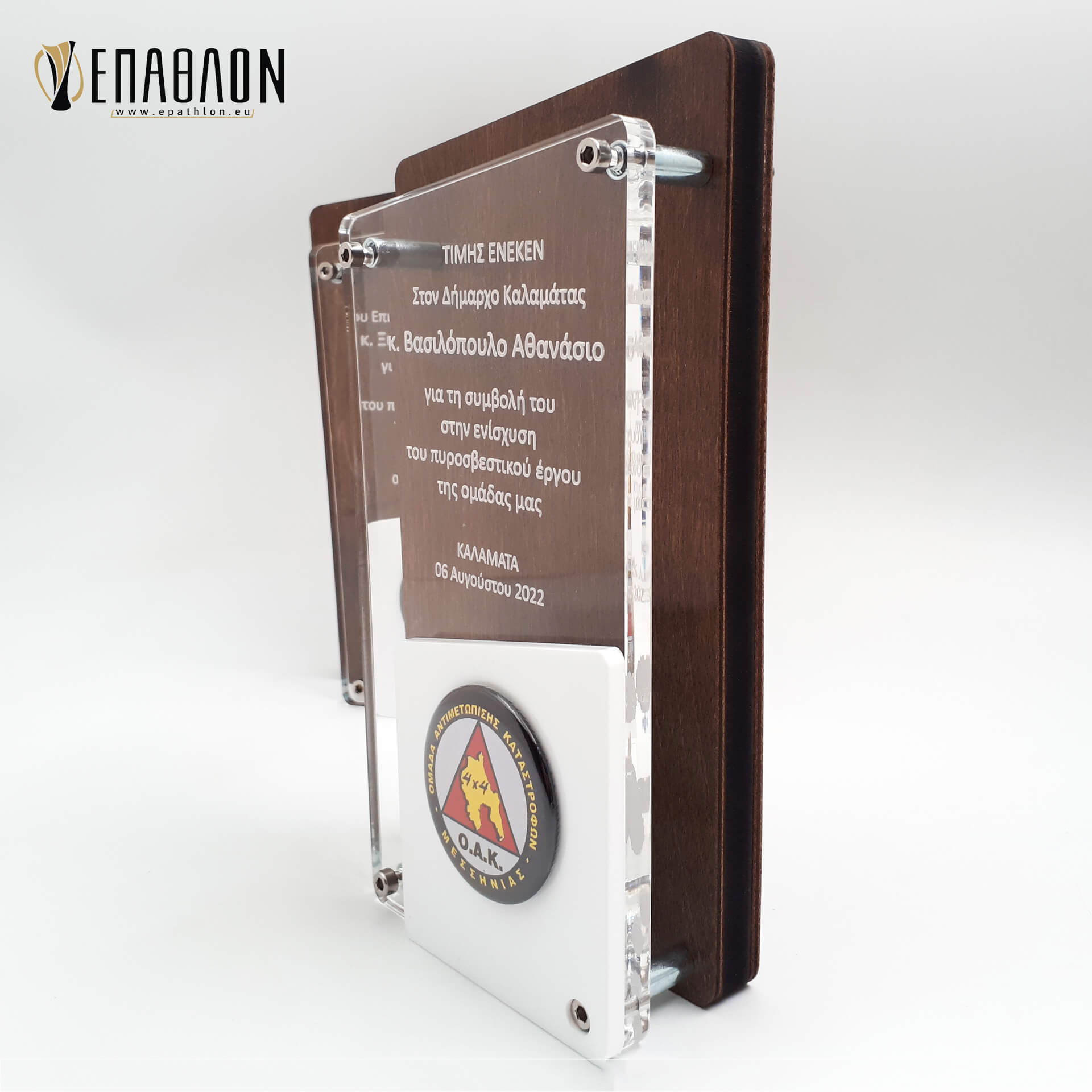 Custom αναμνηστική πλακέτα από το συνδυασμό ξύλου και ακρυλικού • Διάσταση: 13x22cm • Υλικά: Πλάτη από ξύλο πάχους 10mm, διάφανο ακρυλικό πάχους 8mm με χάραξη και λευκό πάχους 5mm, λογότυπο σε κονκάρδα