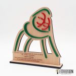• Υλικά: Ξύλο πάχους 7mm με χάραξη, πράσινο και κόκκινο ακρυλικό πάχους 3mm για το σχηματισμό του λογοτύπου, βάση από ξύλο