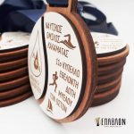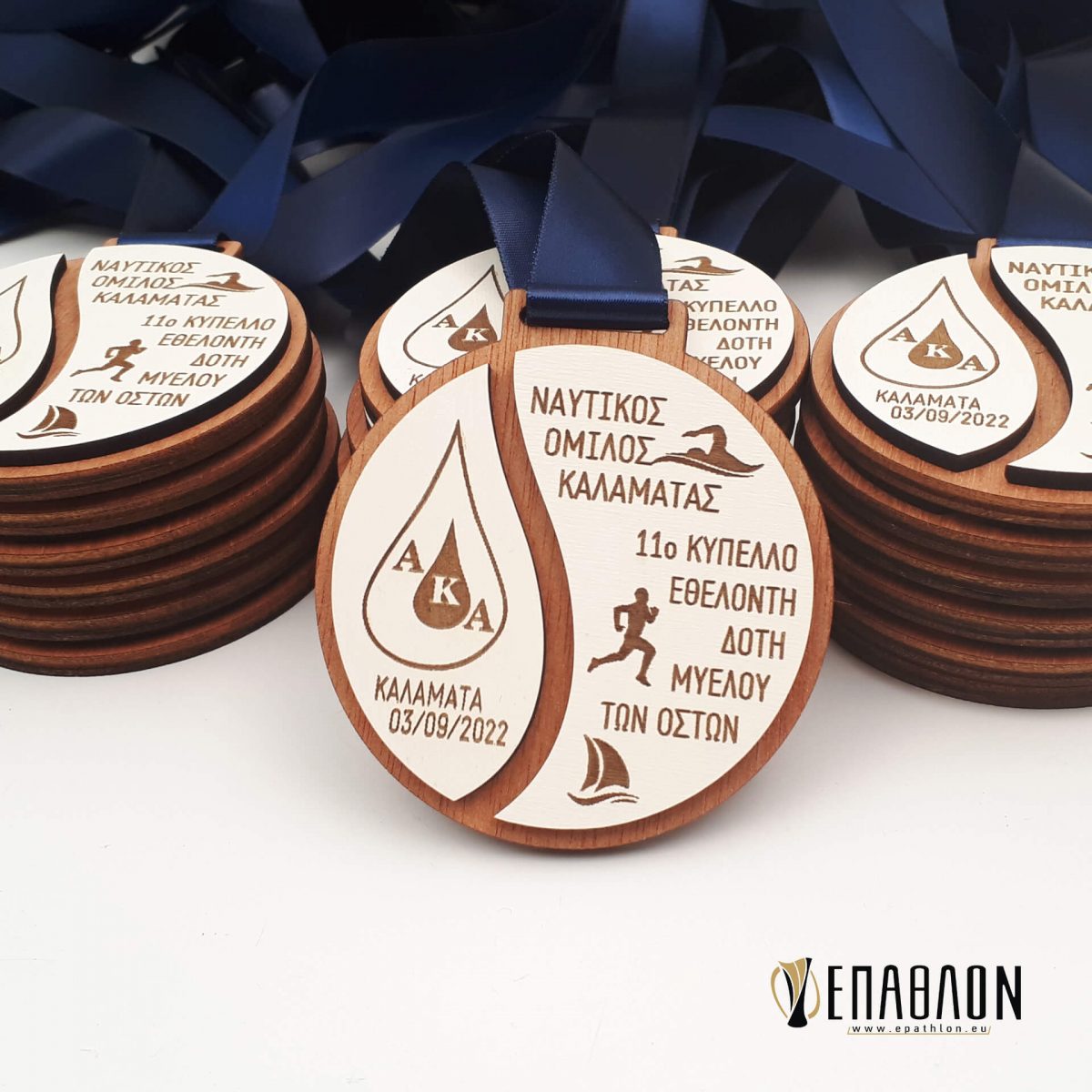 Custom ξύλινο μετάλλιο με το συνδυασμό 2 διαφορετικών ξύλων • Υλικά: Πλάτη από ξύλο πάχους 4mm, λευκό ξύλο πάχους 3mm με χάραξη, Κορδέλα φάρδους 20mm