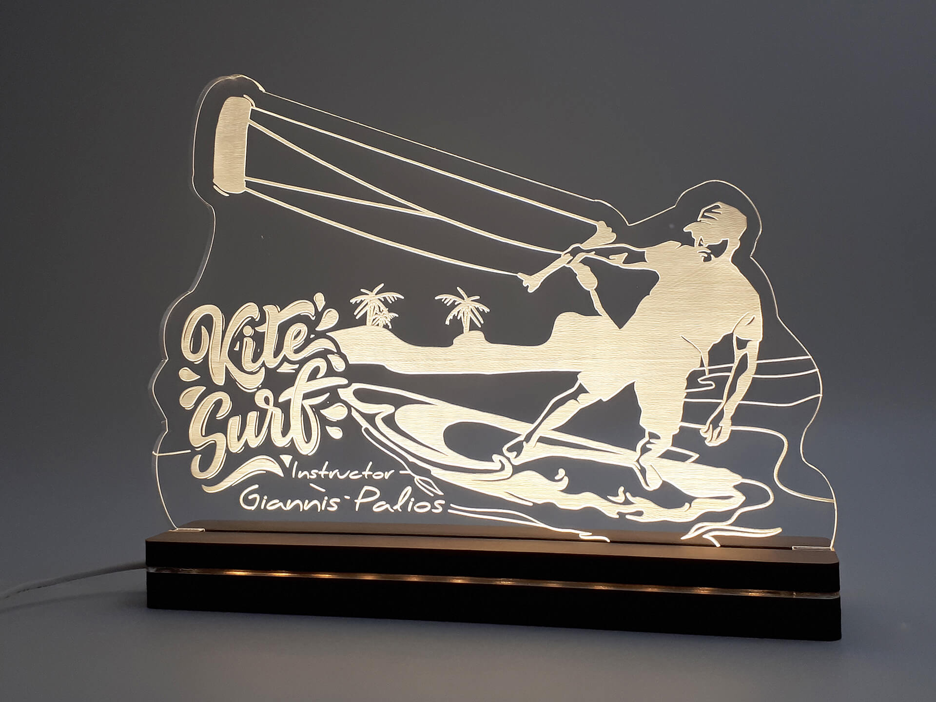 • Υλικά: Led λευκού χρώματος, Ακρυλικό διάφανο πάχους 6mm, Χειροποίητη βάση από ξύλο και ακρυλικό