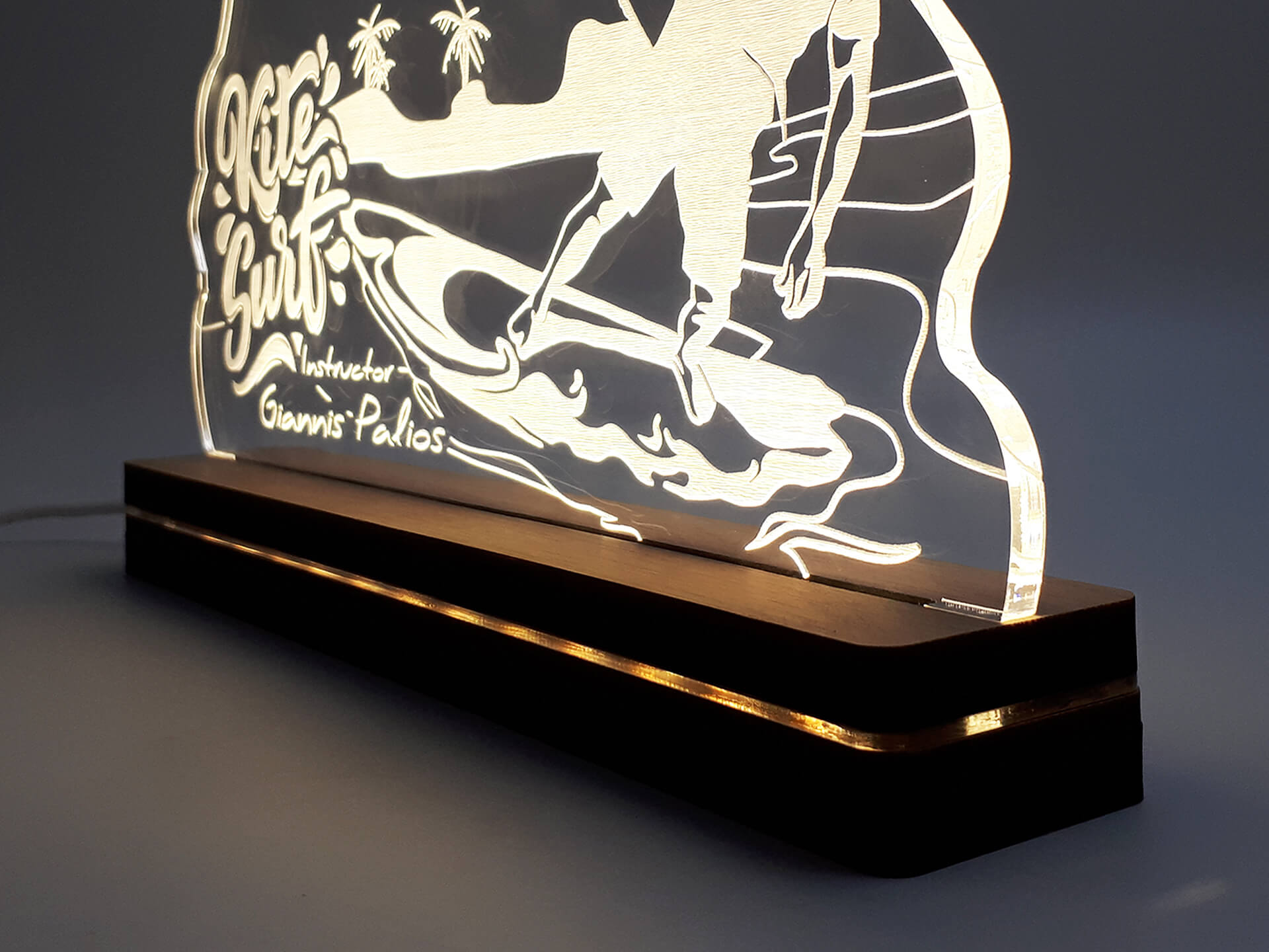 Φωτιστικό Led από ακρυλικό και ξύλινη χειροποίητη βάση δικής μας πρωτοποριακής σχεδίασης και κατασκευής.