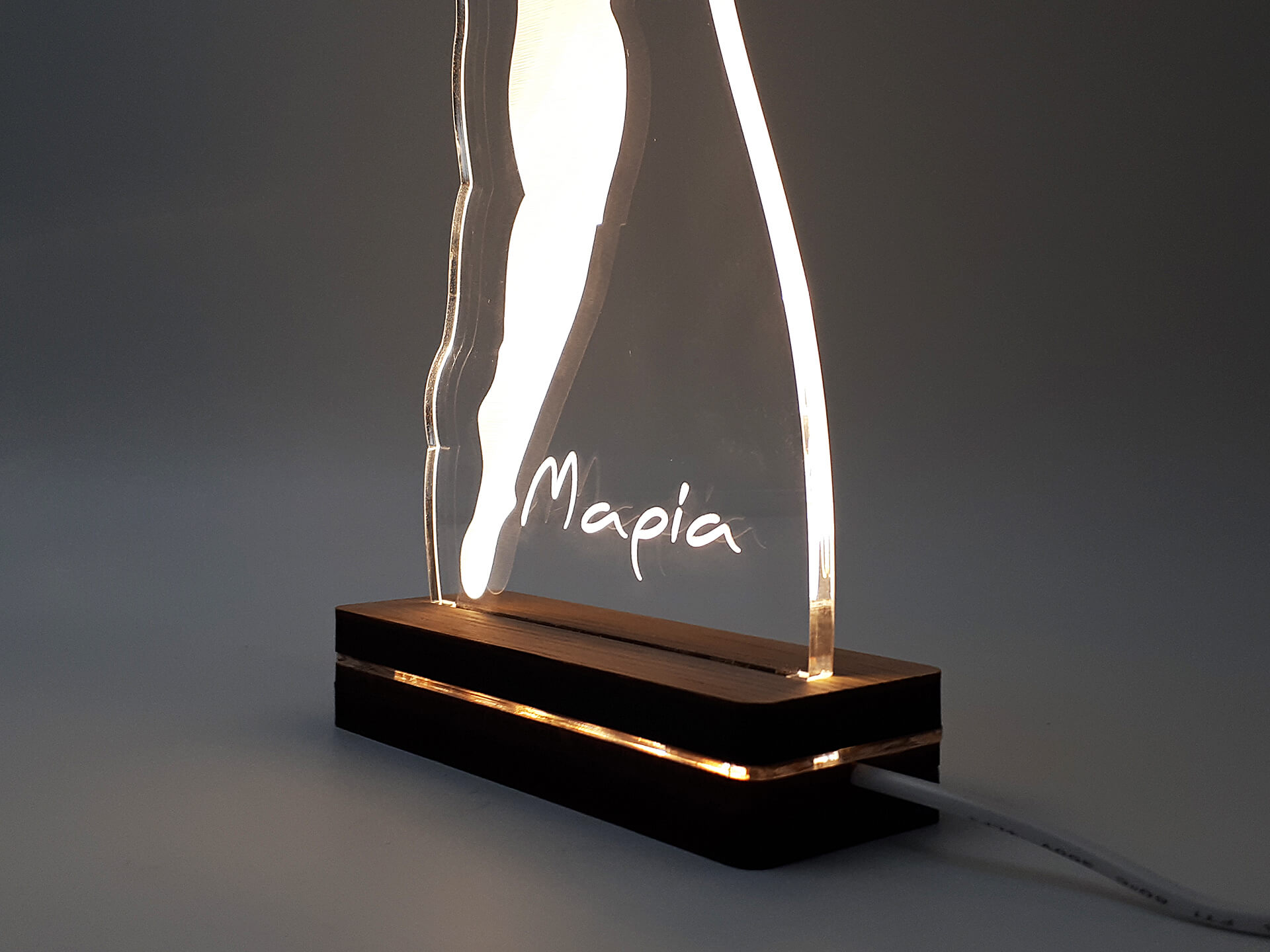 Φωτιστικό Led από ακρυλικό και ξύλινη χειροποίητη βάση δικής μας πρωτοποριακής σχεδίασης και κατασκευής.