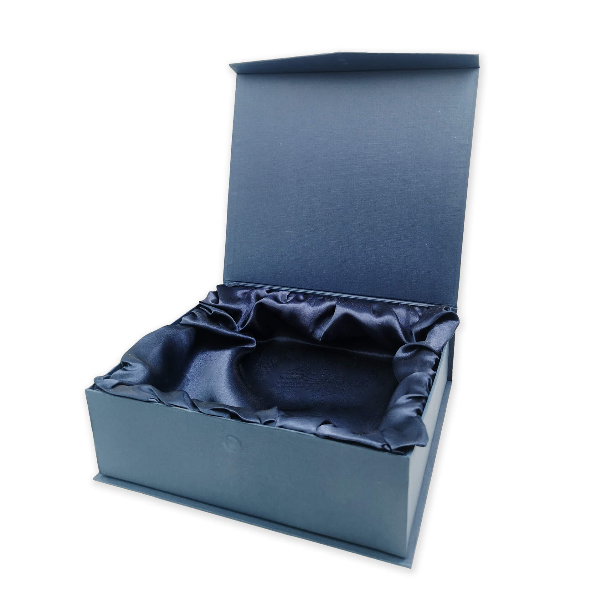Κουτί πλακέτας χρώματος μπλε με επένδυση σατέν μπλε χρώματος Κουτί διάστασης 23x21x8,5cm : Ωφέλιμος εσωτερικός χώρος 18x16x5,5cm