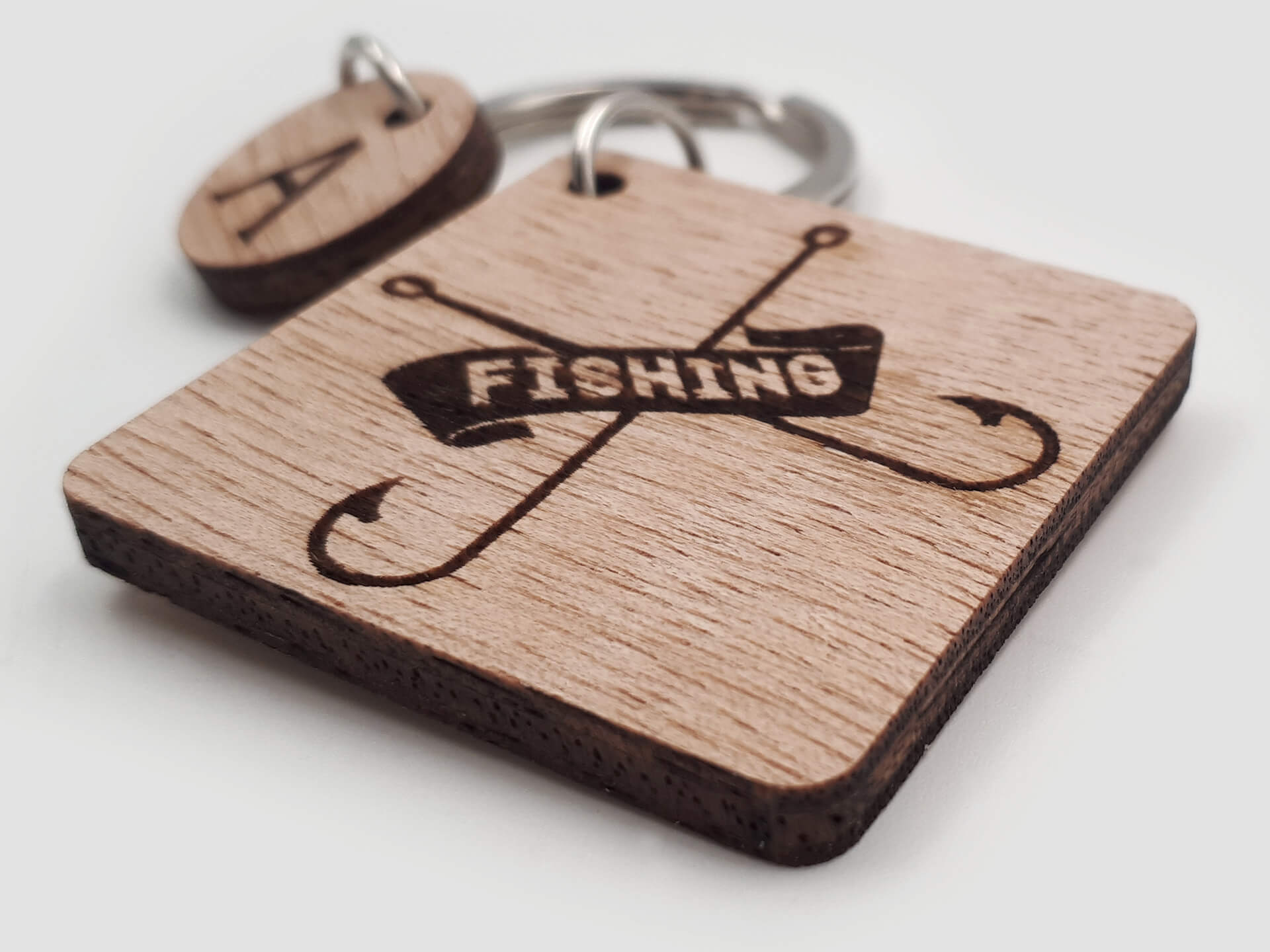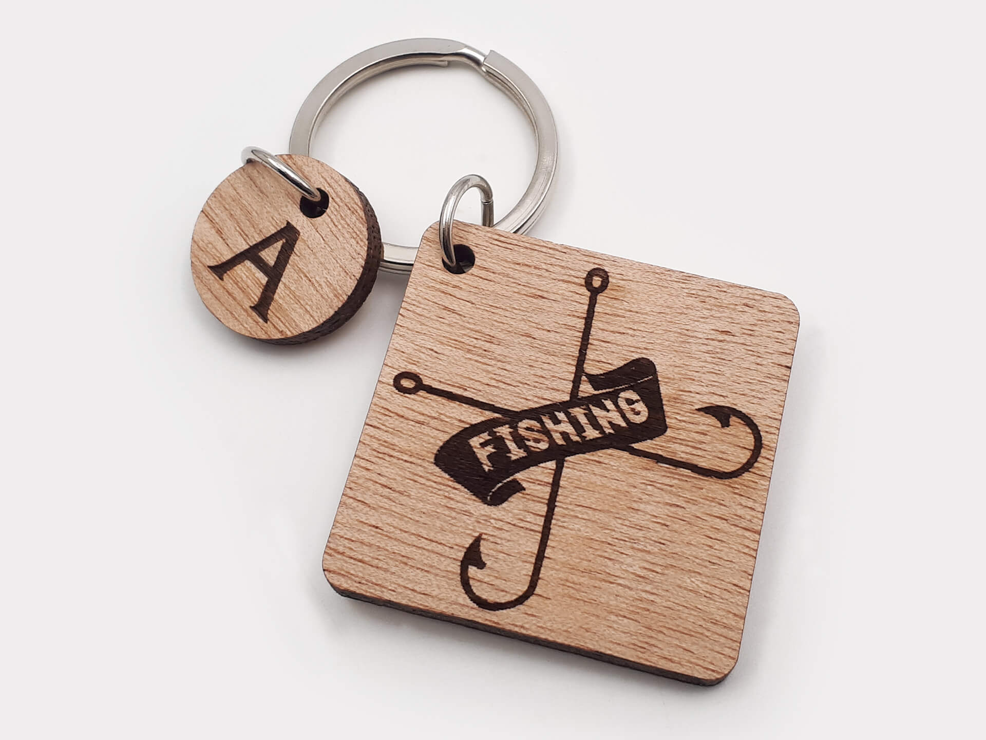 Πρωτότυπο ξύλινο μπρελόκ με θέμα το ψάρεμα για τους λάτρεις του είδους.