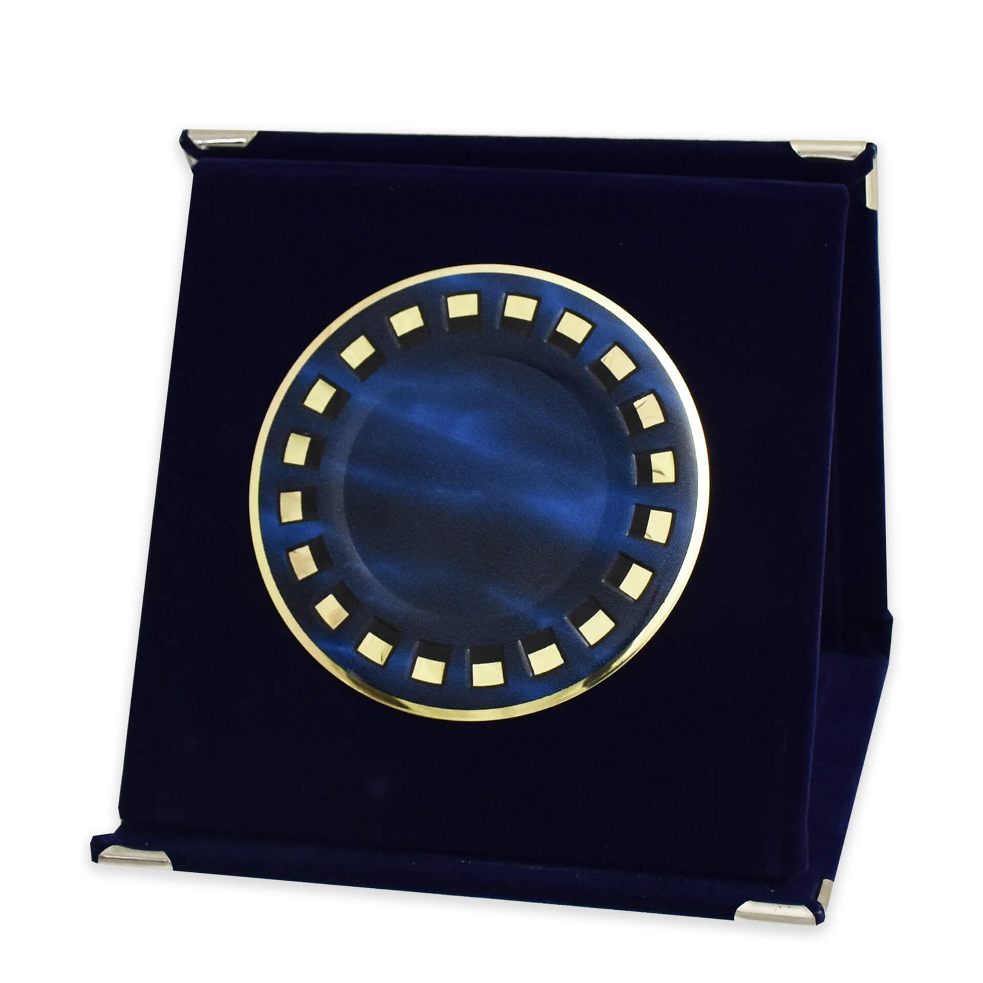 Τιμητική πλακέτα με βελούδινη κασετίνα μπλε χρώματος με μεταλλικές λεπτομέρειες και μπλε αλουμίνιο