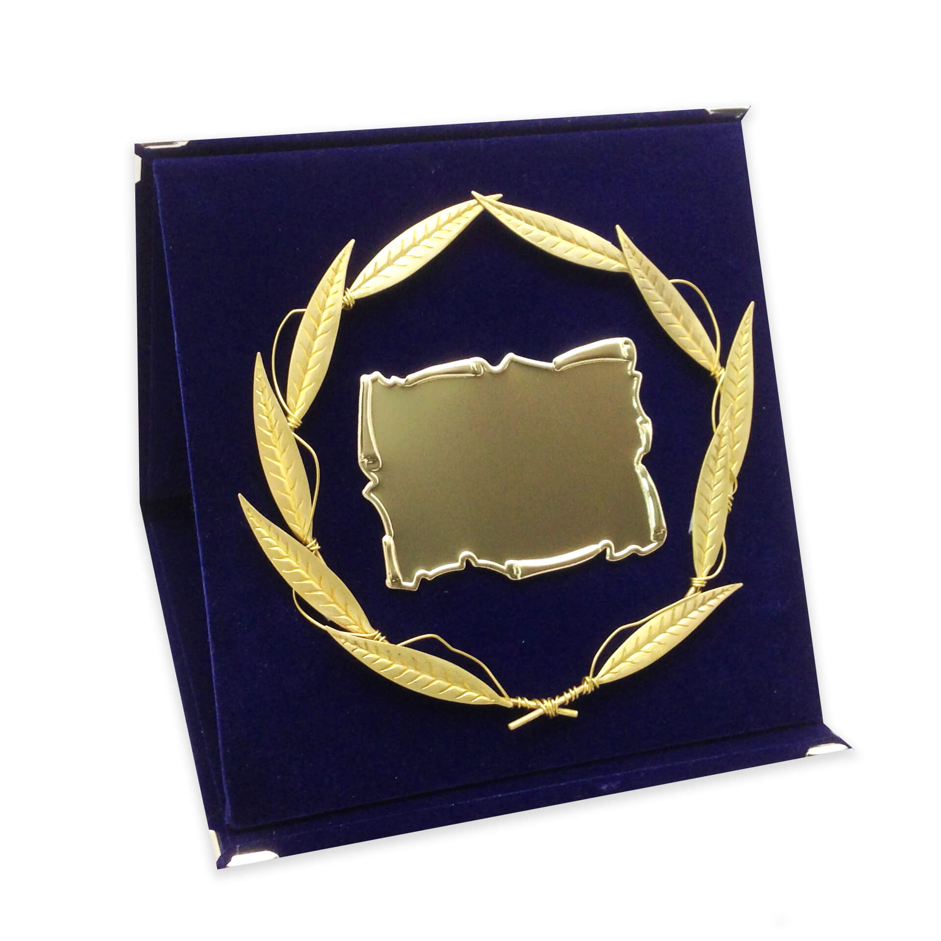 Τιμητική πλακέτα με βελούδινη κασετίνα μπλε χρώματος με μεταλλικές λεπτομέρειες, χρυσό αλουμίνιο και χειροποίητο στεφάνι ελιάς