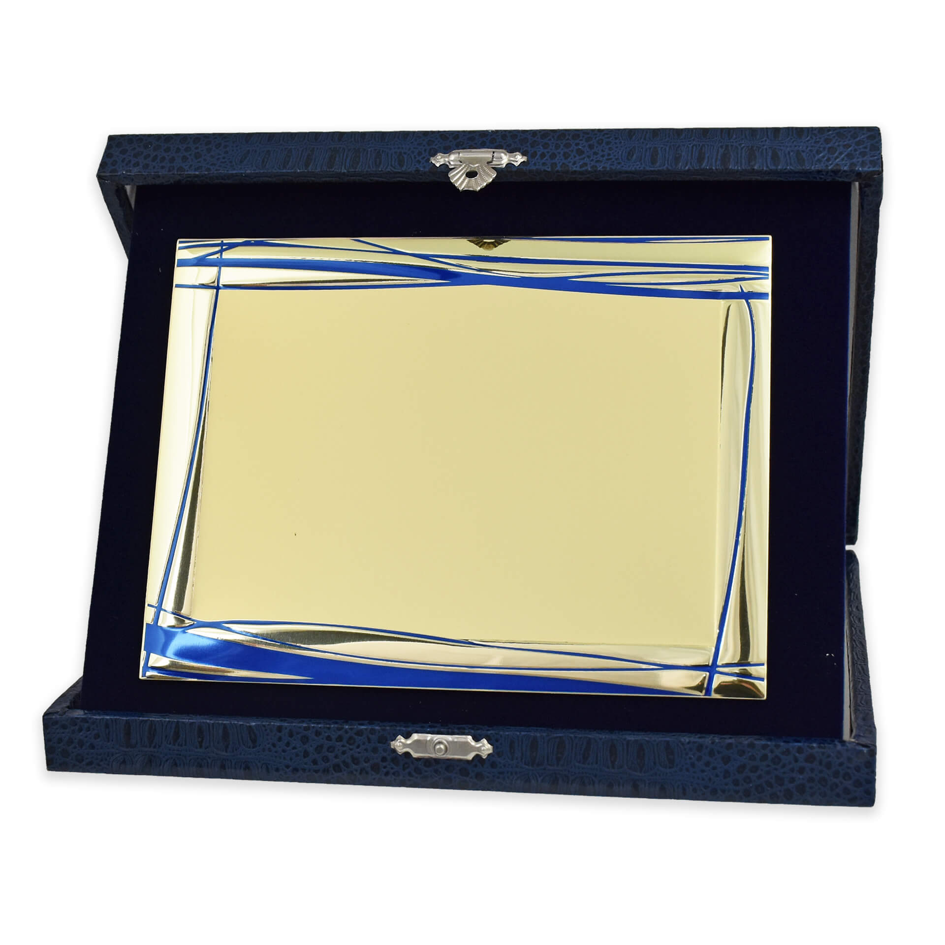 Τιμητική πλακέτα με κροκοδειλέ κασετίνα μπλε χρώματος με μεταλλικό κούμπωμα και χρυσό αλουμίνιο