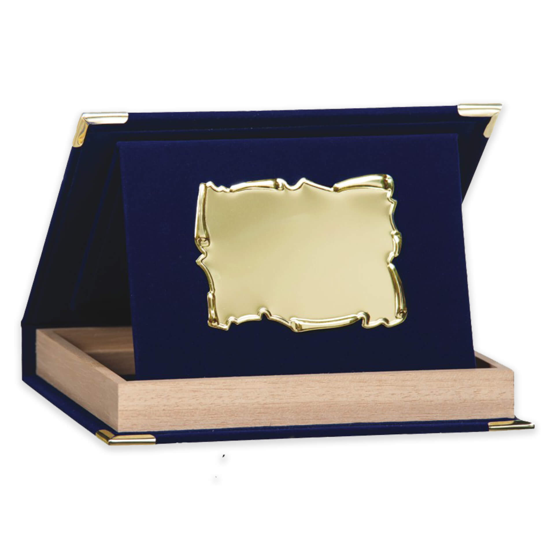 Τιμητική πλακέτα με βελούδινη κασετίνα μπλε χρώματος με ξύλινη επένδυση, μεταλλικές λεπτομέρειες και χρυσό αλουμίνιο