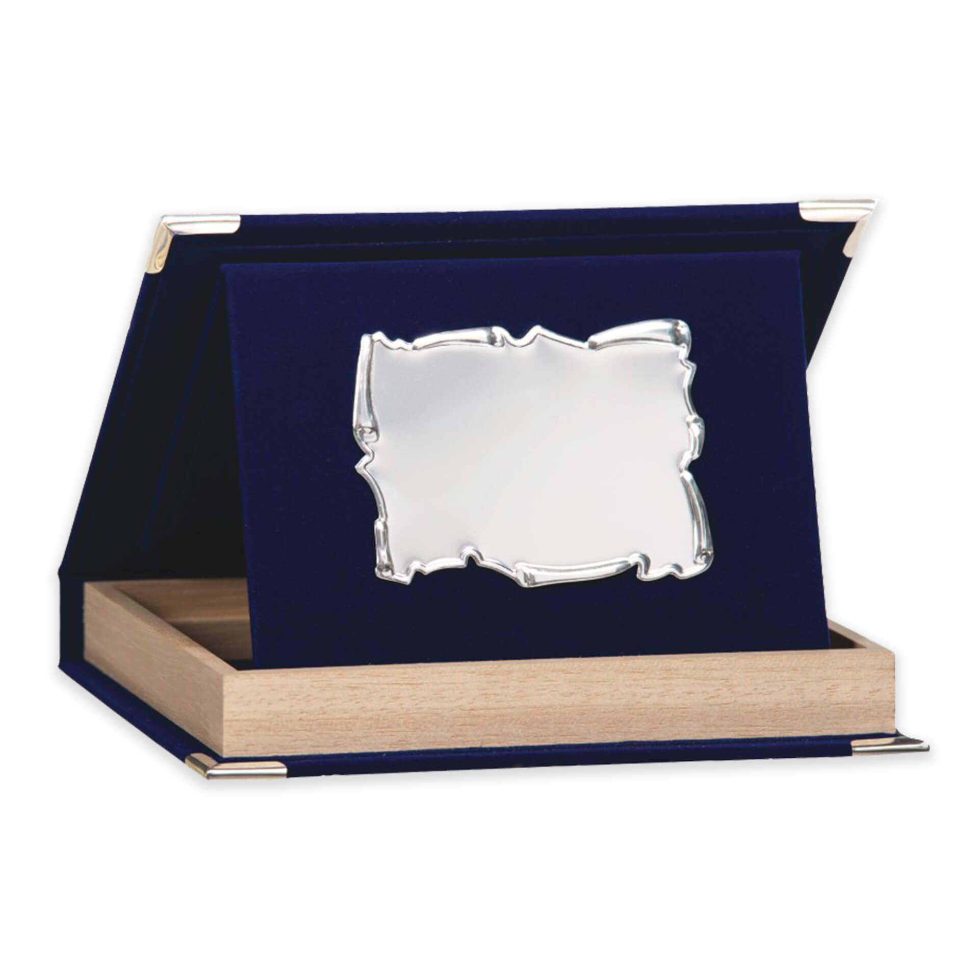 Τιμητική πλακέτα με βελούδινη κασετίνα μπλε χρώματος με ξύλινη επένδυση, μεταλλικές λεπτομέρειες και ασημί αλουμίνιο