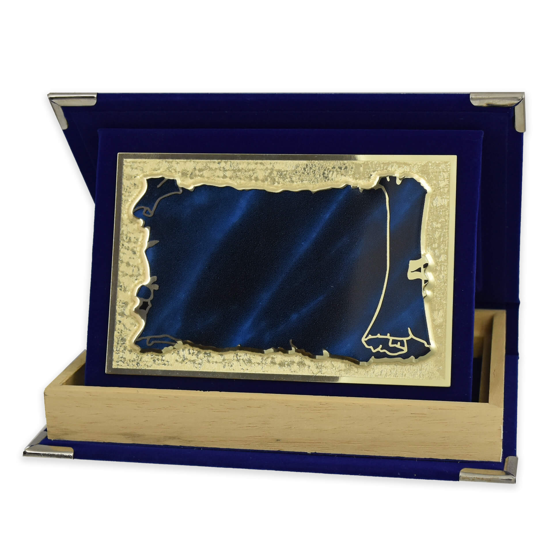 Τιμητική πλακέτα με βελούδινη κασετίνα μπλε χρώματος με ξύλινη επένδυση, μεταλλικές λεπτομέρειες και μπλε αλουμίνιο