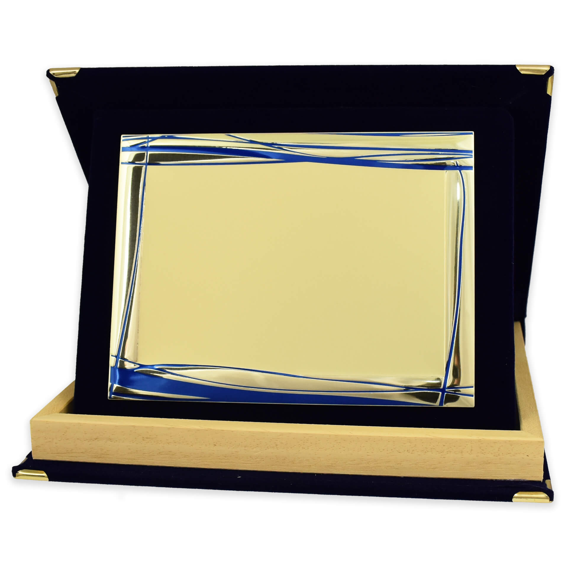 Τιμητική πλακέτα με βελούδινη κασετίνα μπλε χρώματος με ξύλινη επένδυση, μεταλλικές λεπτομέρειες και χρυσό αλουμίνιο