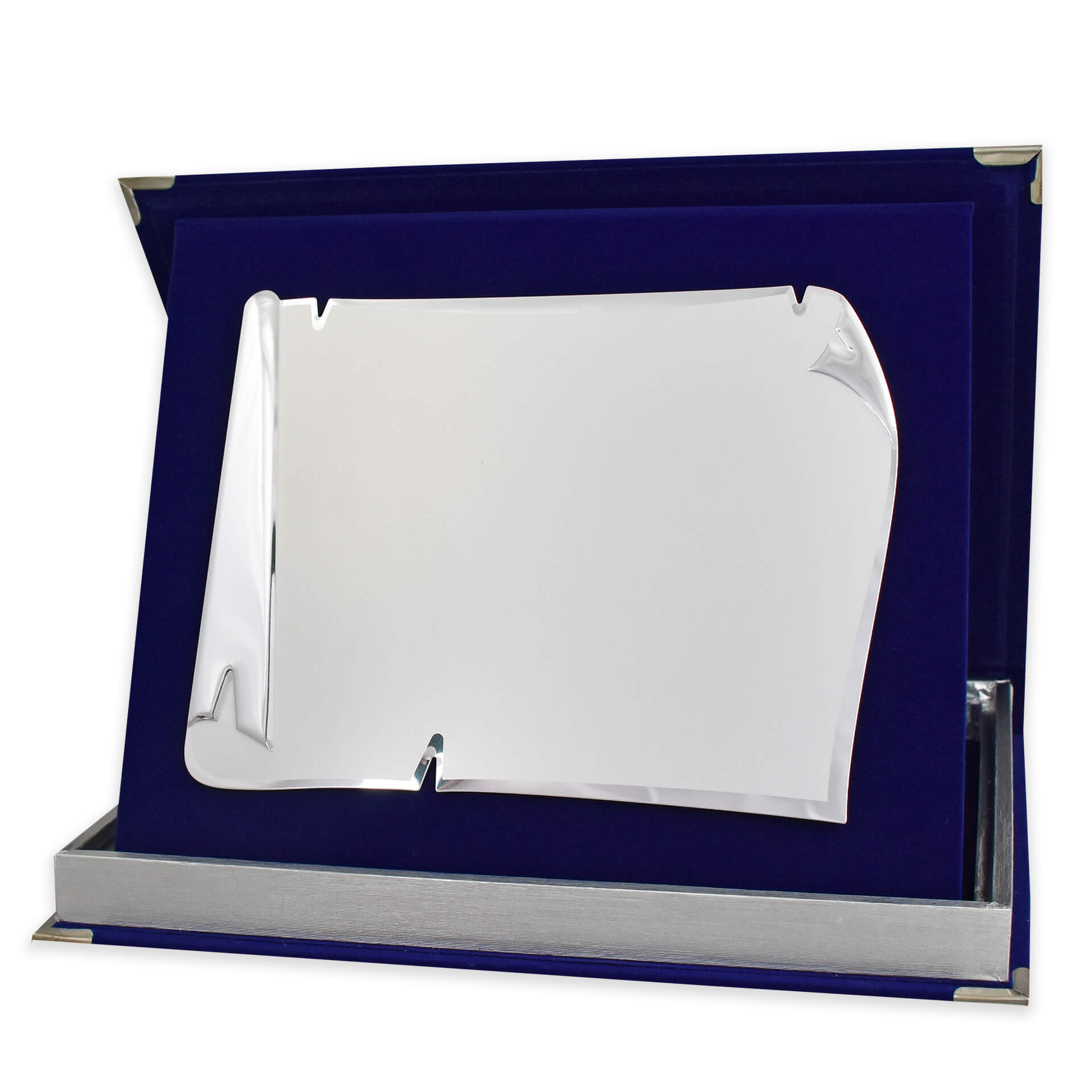 Τιμητική πλακέτα με βελούδινη κασετίνα μπλε χρώματος με ξύλινη επένδυση, μεταλλικές λεπτομέρειες και ασημί αλουμίνιο