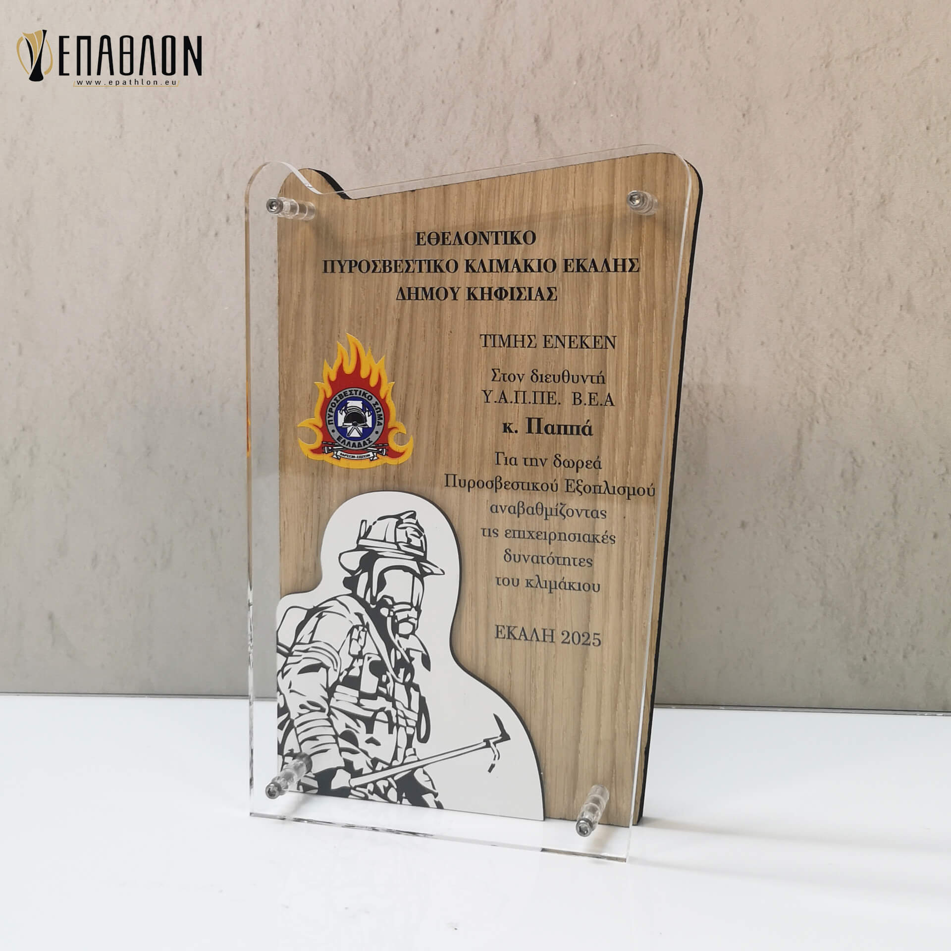 Αναμνηστική πλακέτα από συνδυασμό ξύλων και plexiglass με εκτύπωση επάνω στα υλικά
