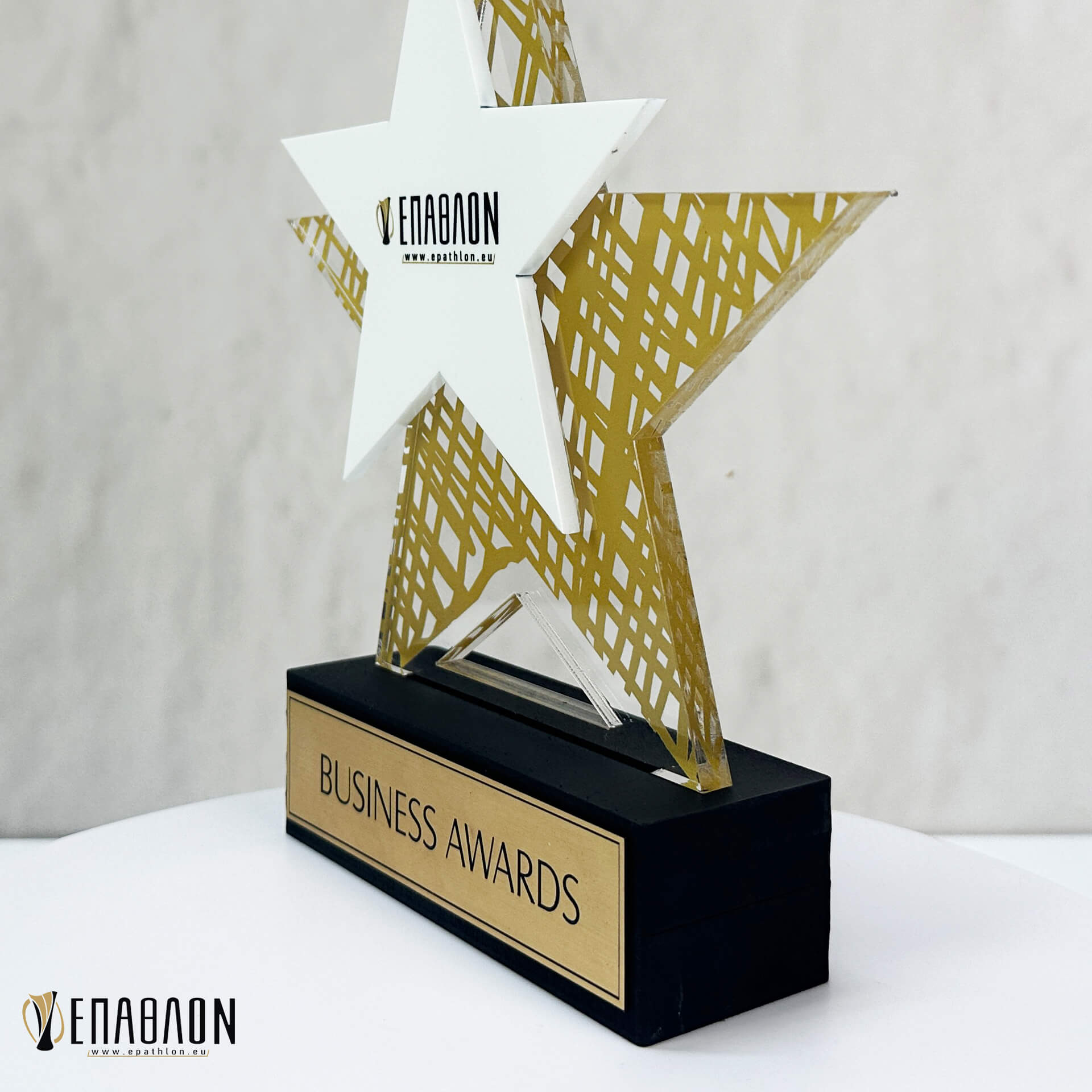 Επιχειρηματικό Βραβείο από plexiglass και ξύλο με έγχρωμη εκτύπωση επάνω στα υλικά
