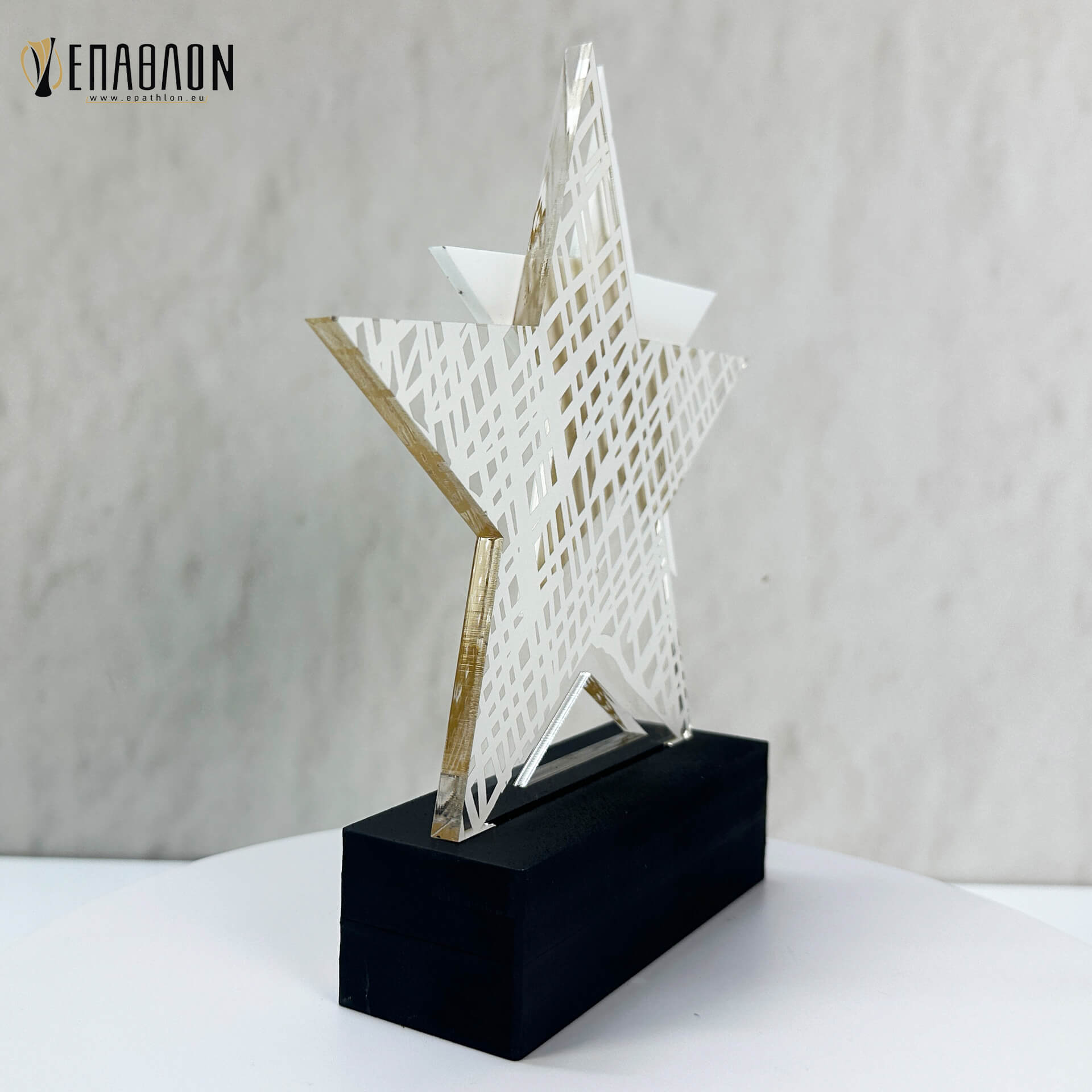 Υλικα: Plexiglass διάφανο πάχους 8mm, plexiglass λευκό πάχους 3mm, βάση από layer ξύλων πάχους 10mm βαμμένο μαύρο, ταμπελάκι από darwin χρυσό